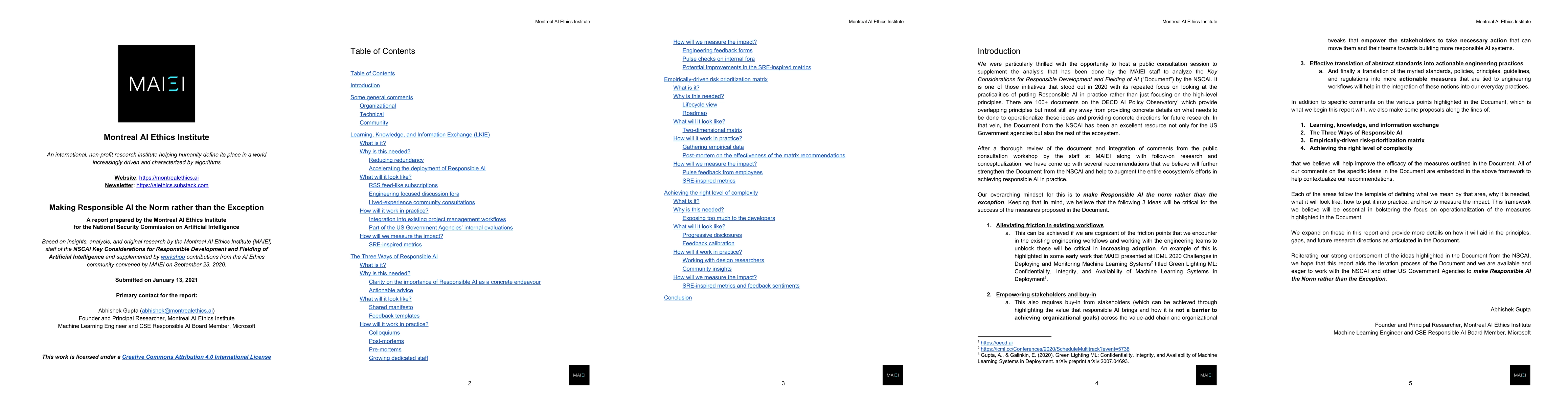 This report prepared by the Montreal AI Ethics Institute provides recommendations in response to the National Security Commission on Artificial Intelligence (NSCAI) Key Considerations for Responsible Development and Fielding of Artificial Intelligence document. The report centres on the idea that Responsible AI should be made the Norm rather than an Exception. It does so by utilizing the guiding principles of: (1) alleviating friction in existing workflows, (2) empowering stakeholders to get buy-in, and (3) conducting an effective translation of abstract standards into actionable engineering practices. After providing some overarching comments on the document from the NSCAI, the report dives into the primary contribution of an actionable framework to help operationalize the ideas presented in the document from the NSCAI. The framework consists of: (1) a learning, knowledge, and information exchange (LKIE), (2) the Three Ways of Responsible AI, (3) an empirically-driven risk-prioritization matrix, and (4) achieving the right level of complexity. All components reinforce each other to move from principles to practice in service of making Responsible AI the norm rather than the exception.