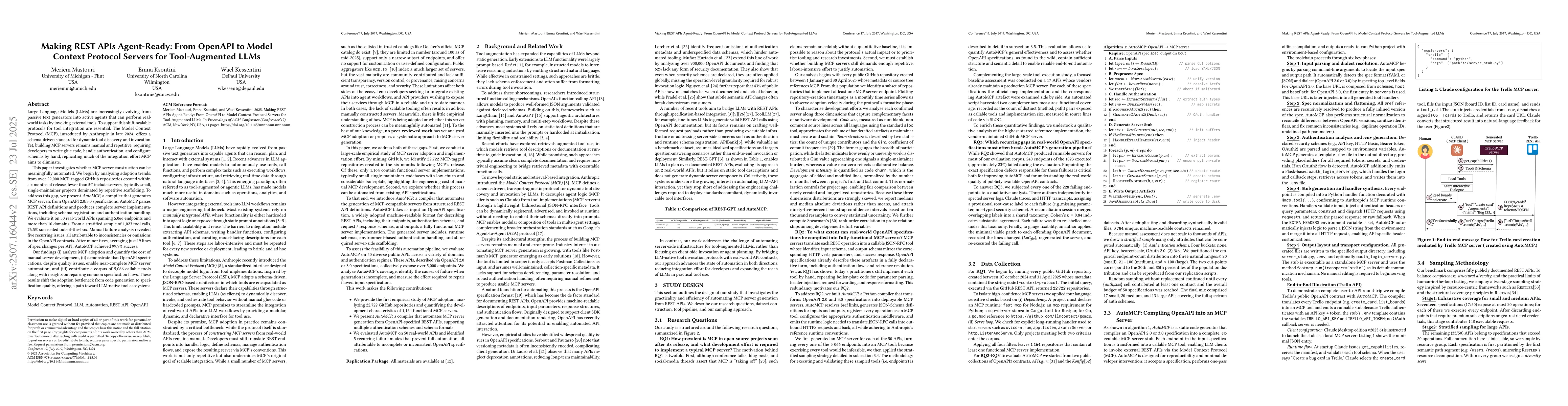 Large Language Models (LLMs) are evolving from passive text generators into active agents that invoke external tools. To support this shift, scalable protocols for tool integration are essential. The Model Context Protocol (MCP), introduced by Anthropic in 2024, offers a schema-driven standard for dynamic tool discovery and invocation. Yet, building MCP servers remains manual and repetitive, requiring developers to write glue code, handle authentication, and configure schemas by hand-replicating much of the integration effort MCP aims to eliminate. This paper investigates whether MCP server construction can be meaningfully automated. We begin by analyzing adoption trends: among 22,000+ MCP-tagged GitHub repositories created within six months of release, fewer than 5% include servers, typically small, single-maintainer projects dominated by repetitive scaffolding. To address this gap, we present AutoMCP, a compiler that generates MCP servers from OpenAPI 2.0/3.0 specifications. AutoMCP parses REST API definitions and produces complete server implementations, including schema registration and authentication handling. We evaluate AutoMCP on 50 real-world APIs spanning 5,066 endpoints across over 10 domains. From a stratified sample of 1,023 tool calls, 76.5% succeeded out of the box. Manual failure analysis revealed five recurring issues, all attributable to inconsistencies or omissions in the OpenAPI contracts. After minor fixes, averaging 19 lines of spec changes per API, AutoMCP achieved 99.9% success. Our findings (i) analyze MCP adoption and quantify the cost of manual server development, (ii) demonstrate that OpenAPI specifications, despite quality issues, enable near-complete MCP server automation, and (iii) contribute a corpus of 5,066 callable tools along with insights on repairing common specification flaws.
