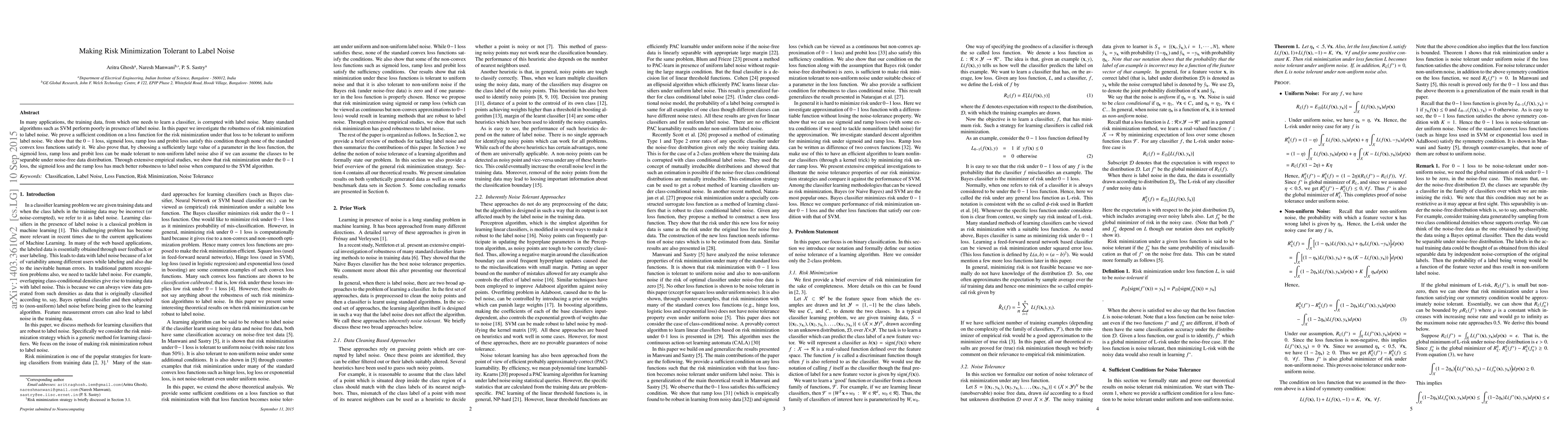This paper investigates how risk minimization can be made robust to label noise in training data, proving that certain loss functions like the $0-1$, sigmoid, ramp, and probit loss are naturally tolerant to uniform label noise. It also demonstrates that with an appropriate parameter adjustment, these losses can handle non-uniform label noise, outperforming standard SVMs in empirical studies.