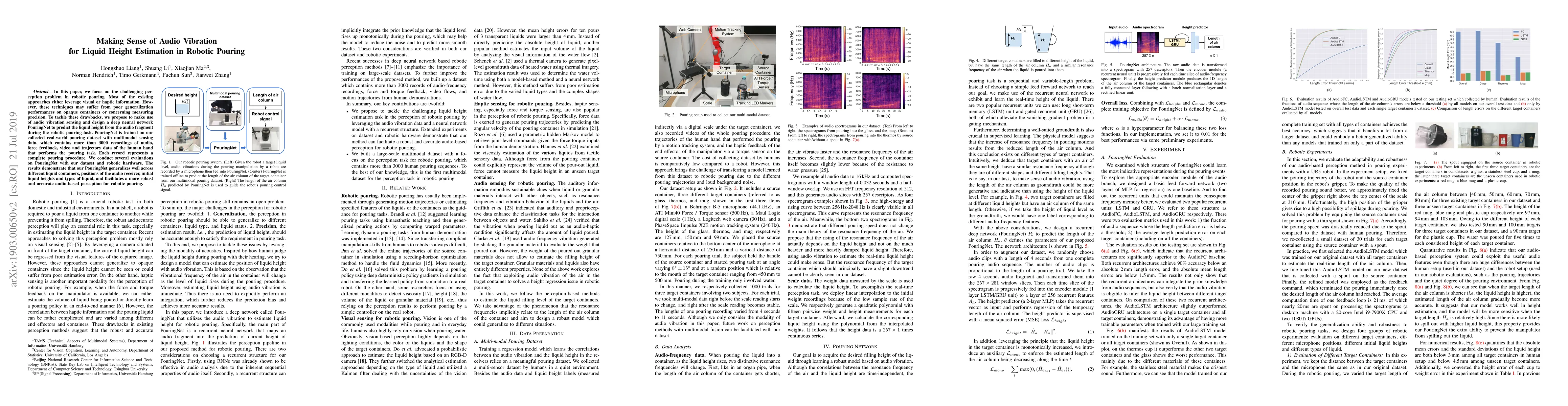 This paper proposes a novel method using audio vibration sensing and a deep neural network called PouringNet to estimate liquid height in robotic pouring, addressing limitations of visual and haptic approaches. PouringNet trained on a multimodal dataset shows robust generalization and accuracy across various pouring conditions.