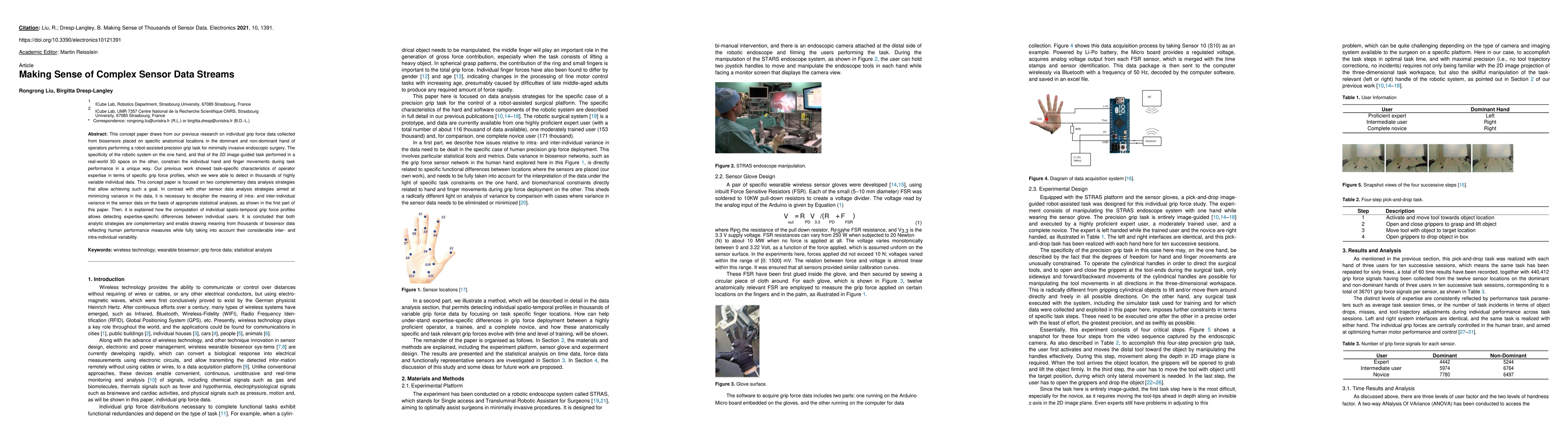This concept paper draws from our previous research on individual grip force data collected from biosensors placed on specific anatomical locations in the dominant and non dominant hands of operators performing a robot assisted precision grip task for minimally invasive endoscopic surgery. The specificity of the robotic system on the one hand, and that of the 2D image guided task performed in a real world 3D space on the other, constrain the individual hand and finger movements during task performance in a unique way. Our previous work showed task specific characteristics of operator expertise in terms of specific grip force profiles, which we were able to detect in thousands of highly variable individual data. This concept paper is focused on two complementary data analysis strategies that allow achieving such a goal. In contrast with other sensor data analysis strategies aimed at minimizing variance in the data, it is in this case here necessary to decipher the meaning of the full extent of intra and inter individual variance in the sensor data by using the appropriate statistical analyses, as shown in the first part of this paper. Then, it is explained how the computation of individual spatio temporal grip force profiles permits detecting expertise specific differences between individual users. It is concluded that these two analytic strategies are complementary. They enable drawing meaning from thousands of biosensor data reflecting human grip performance and its evolution with training, while fully taking into account their considerable inter and intra individual variability.
