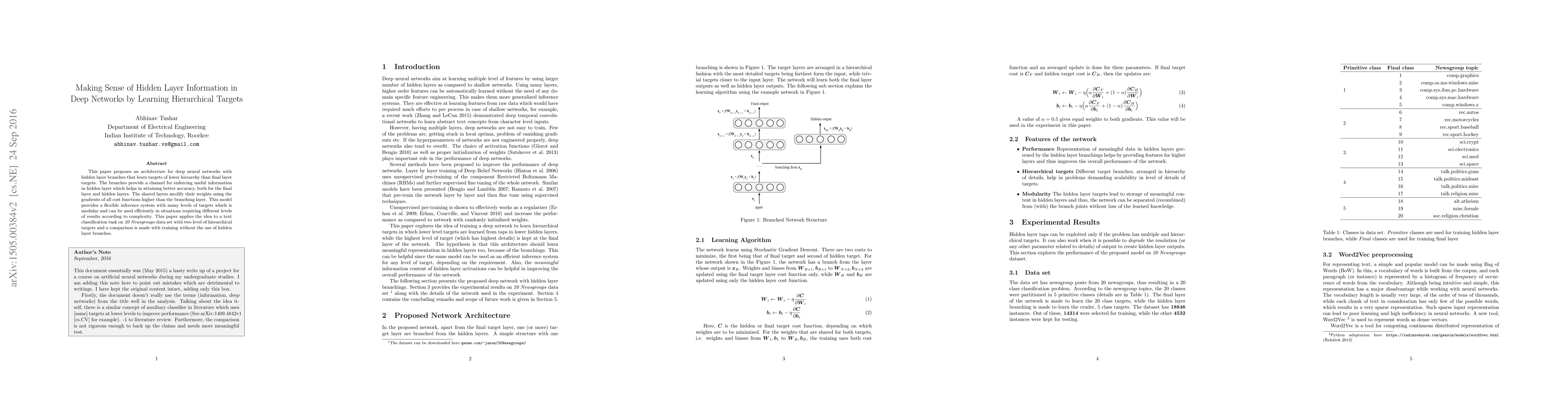 This paper introduces a deep neural network architecture with hidden layer branches that learn lower-level hierarchical targets, enhancing accuracy across layers. The model, tested on text classification, shows improved performance compared to traditional training methods.