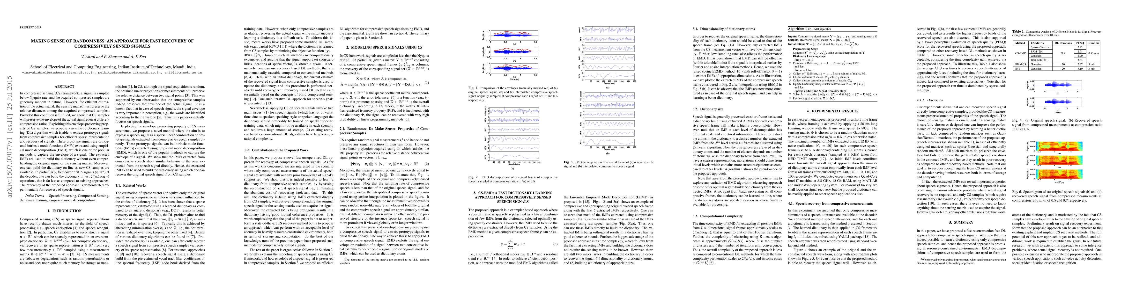 The paper introduces a fast method for recovering signals from compressed, randomly sampled data by leveraging the preservation of the signal's envelope. It uses a new dictionary learning approach based on empirical mode decomposition to efficiently reconstruct signals, demonstrated effectively on speech data.