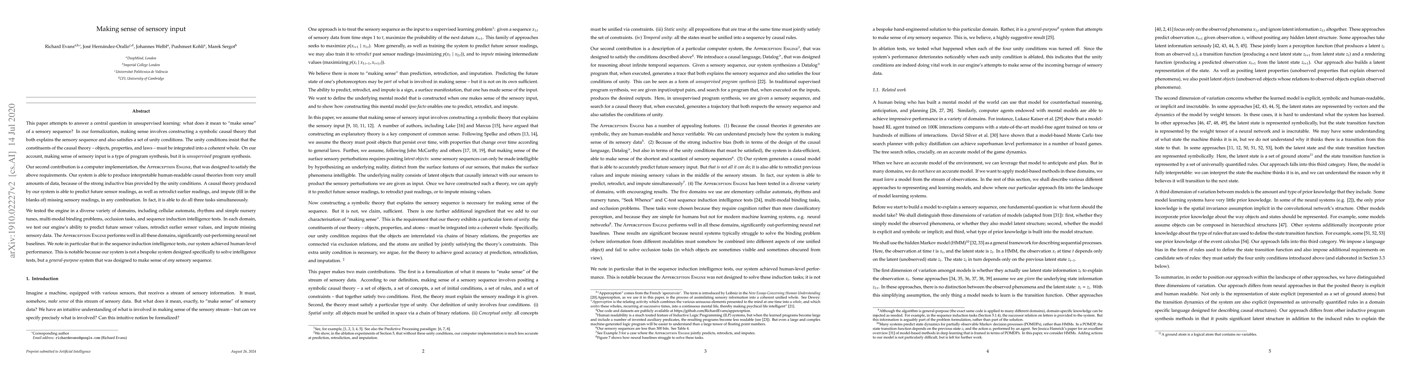 This paper attempts to answer a central question in unsupervised learning: what does it mean to "make sense" of a sensory sequence? In our formalization, making sense involves constructing a symbolic causal theory that both explains the sensory sequence and also satisfies a set of unity conditions. The unity conditions insist that the constituents of the causal theory -- objects, properties, and laws -- must be integrated into a coherent whole. On our account, making sense of sensory input is a type of program synthesis, but it is unsupervised program synthesis. Our second contribution is a computer implementation, the Apperception Engine, that was designed to satisfy the above requirements. Our system is able to produce interpretable human-readable causal theories from very small amounts of data, because of the strong inductive bias provided by the unity conditions. A causal theory produced by our system is able to predict future sensor readings, as well as retrodict earlier readings, and impute (fill in the blanks of) missing sensory readings, in any combination. We tested the engine in a diverse variety of domains, including cellular automata, rhythms and simple nursery tunes, multi-modal binding problems, occlusion tasks, and sequence induction intelligence tests. In each domain, we test our engine's ability to predict future sensor values, retrodict earlier sensor values, and impute missing sensory data. The engine performs well in all these domains, significantly out-performing neural net baselines. We note in particular that in the sequence induction intelligence tests, our system achieved human-level performance. This is notable because our system is not a bespoke system designed specifically to solve intelligence tests, but a general-purpose system that was designed to make sense of any sensory sequence.