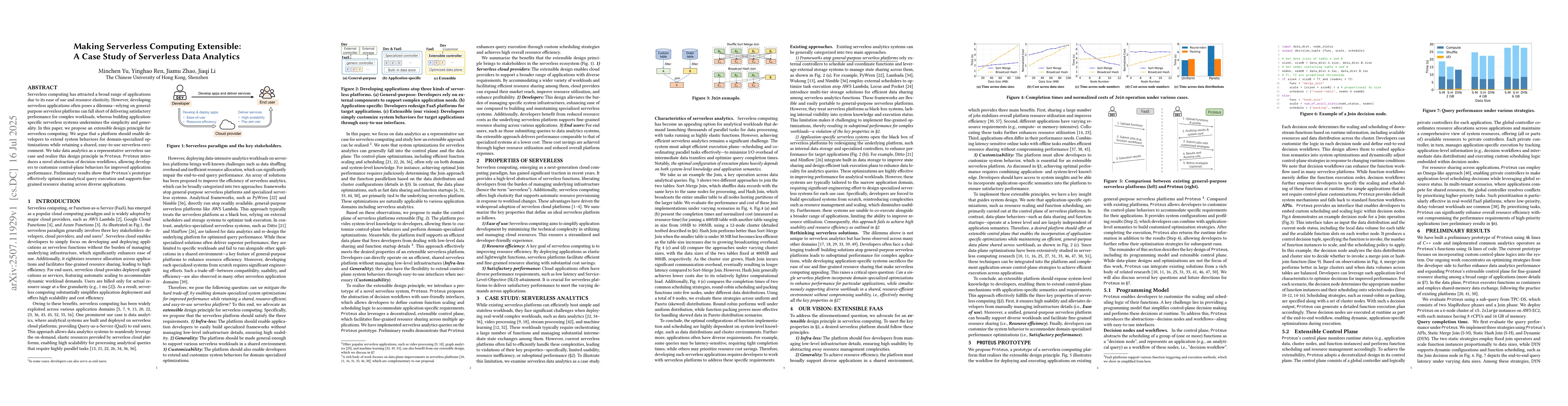 Serverless computing has attracted a broad range of applications due to its ease of use and resource elasticity. However, developing serverless applications often poses a dilemma -- relying on general-purpose serverless platforms can fall short of delivering satisfactory performance for complex workloads, whereas building application-specific serverless systems undermines the simplicity and generality. In this paper, we propose an extensible design principle for serverless computing. We argue that a platform should enable developers to extend system behaviors for domain-specialized optimizations while retaining a shared, easy-to-use serverless environment. We take data analytics as a representative serverless use case and realize this design principle in Proteus. Proteus introduces a novel abstraction of decision workflows, allowing developers to customize control-plane behaviors for improved application performance. Preliminary results show that Proteus's prototype effectively optimizes analytical query execution and supports fine-grained resource sharing across diverse applications.