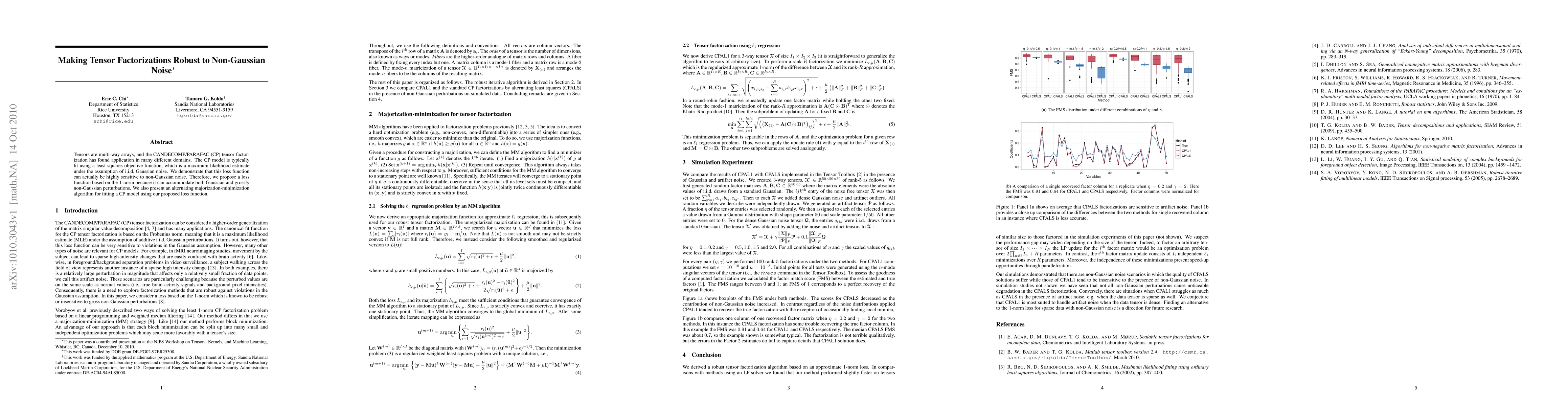 This paper proposes a new loss function based on the 1-norm for tensor factorizations to make them robust to non-Gaussian noise, as the traditional least squares method is sensitive to such perturbations. An alternating majorization-minimization algorithm is introduced for fitting the CP model using this new loss function.
