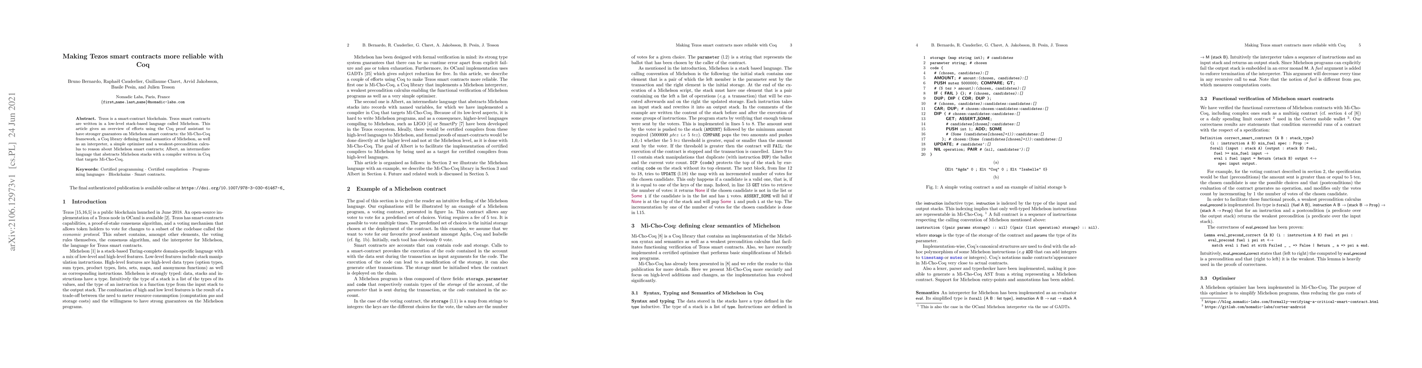 This paper explores using Coq to enhance the reliability of Tezos smart contracts written in Michelson, introducing Mi-Cho-Coq for formal semantics, an interpreter, an optimizer, and a weakest-precondition calculus, along with Albert, an intermediate language with a Coq-based compiler.