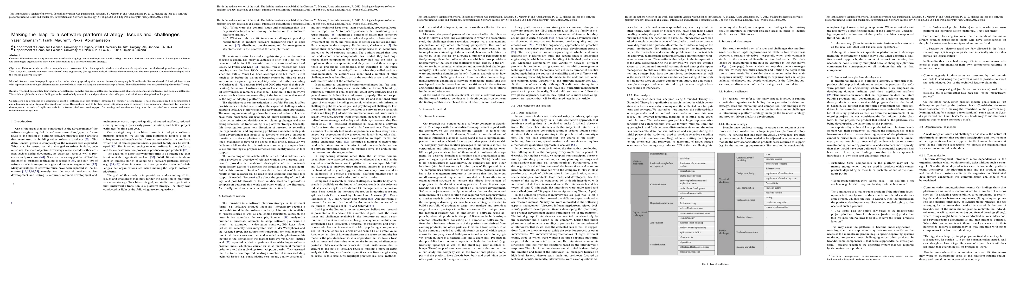 Context: While there are many success stories of achieving high reuse and improved quality using software platforms, there is a need to investigate the issues and challenges organizations face when transitioning to a software platform strategy. Objective: This case study provides a comprehensive taxonomy of the challenges faced when a medium-scale organization decided to adopt software platforms. The study also reveals how new trends in software engineering (i.e. agile methods, distributed development and flat management structures) interplayed with the chosen platform strategy. Method: We used an ethnographic approach to collect data by spending time at a medium-scale company in Scandinavia. We conducted 16 in-depth interviews with representatives of eight different teams, three of which were working on three separate platforms. The collected data was analyzed using Grounded Theory. Results: The findings identify four classes of challenges, namely: business challenges, organizational challenges, technical challenges, and people challenges. The article explains how these findings can be used to help researchers and practitioners identify practical solutions and required tool support. Conclusion: The organization's decision to adopt a software platform strategy introduced a number of challenges. These challenges need to be understood and addressed in order to reap the benefits of reuse. Researchers need to further investigate issues such as supportive organizational structures for platform development, the role of agile methods in software platforms, tool support for testing and continuous integration in the platform context, and reuse recommendation systems.