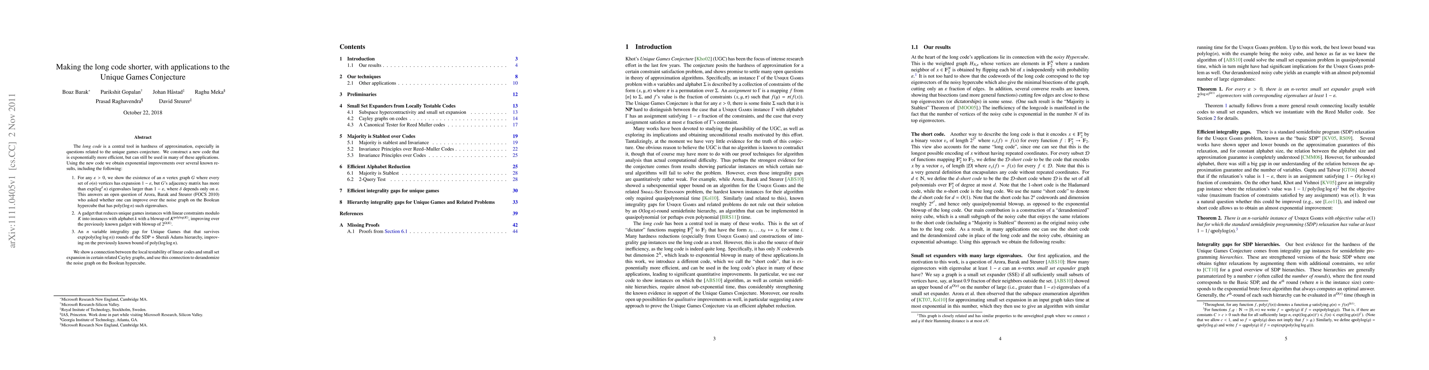 The long code is a central tool in hardness of approximation, especially in questions related to the unique games conjecture. We construct a new code that is exponentially more efficient, but can still be used in many of these applications. Using the new code we obtain exponential improvements over several known results, including the following: 1. For any eps > 0, we show the existence of an n vertex graph G where every set of o(n) vertices has expansion 1 - eps, but G's adjacency matrix has more than exp(log^delta n) eigenvalues larger than 1 - eps, where delta depends only on eps. This answers an open question of Arora, Barak and Steurer (FOCS 2010) who asked whether one can improve over the noise graph on the Boolean hypercube that has poly(log n) such eigenvalues. 2. A gadget that reduces unique games instances with linear constraints modulo K into instances with alphabet k with a blowup of K^polylog(K), improving over the previously known gadget with blowup of 2^K. 3. An n variable integrality gap for Unique Games that that survives exp(poly(log log n)) rounds of the SDP + Sherali Adams hierarchy, improving on the previously known bound of poly(log log n). We show a connection between the local testability of linear codes and small set expansion in certain related Cayley graphs, and use this connection to derandomize the noise graph on the Boolean hypercube.