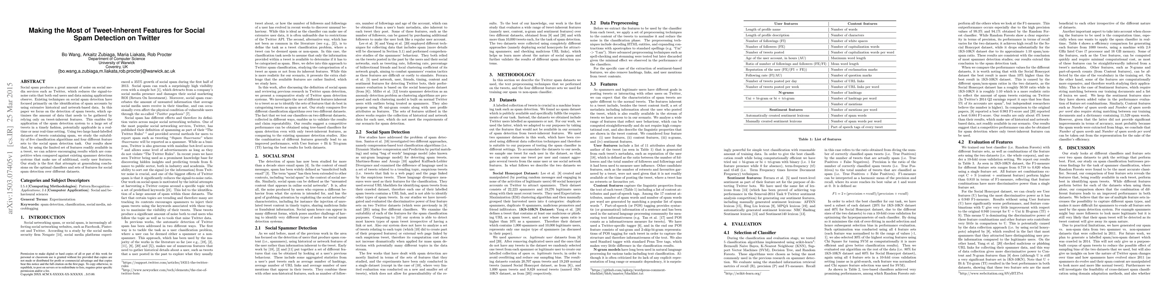 This paper explores the use of tweet-inherent features for detecting social spam on Twitter, optimizing data collection and enabling real-time detection. The study evaluates five classification algorithms and four feature sets on two large datasets, finding competitive results compared to systems using extensive historical and network data.