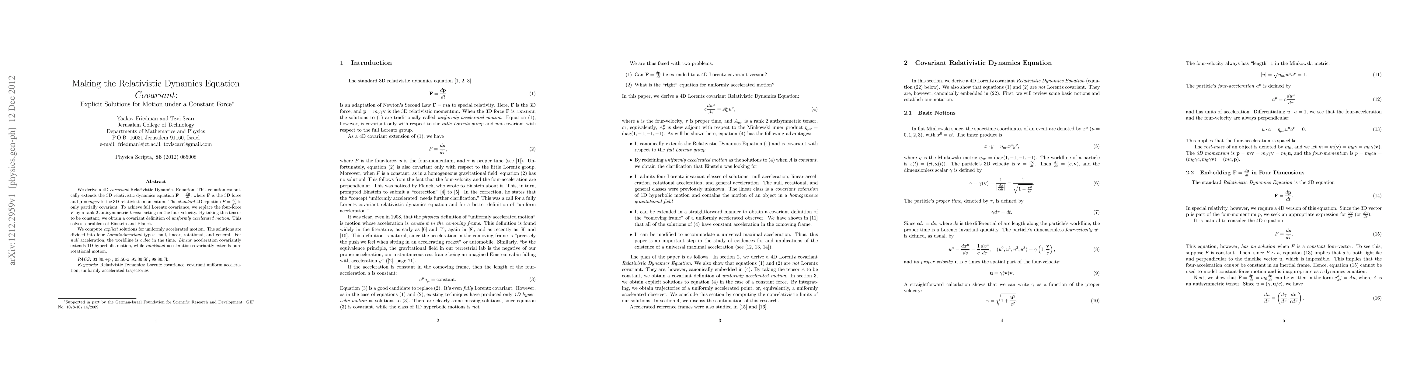 This paper derives a fully covariant 4D relativistic dynamics equation for motion under a constant force, extending the 3D relativistic dynamics equation. It provides explicit solutions for uniformly accelerated motion, categorizing them into four Lorentz-invariant types: null, linear, rotational, and general.