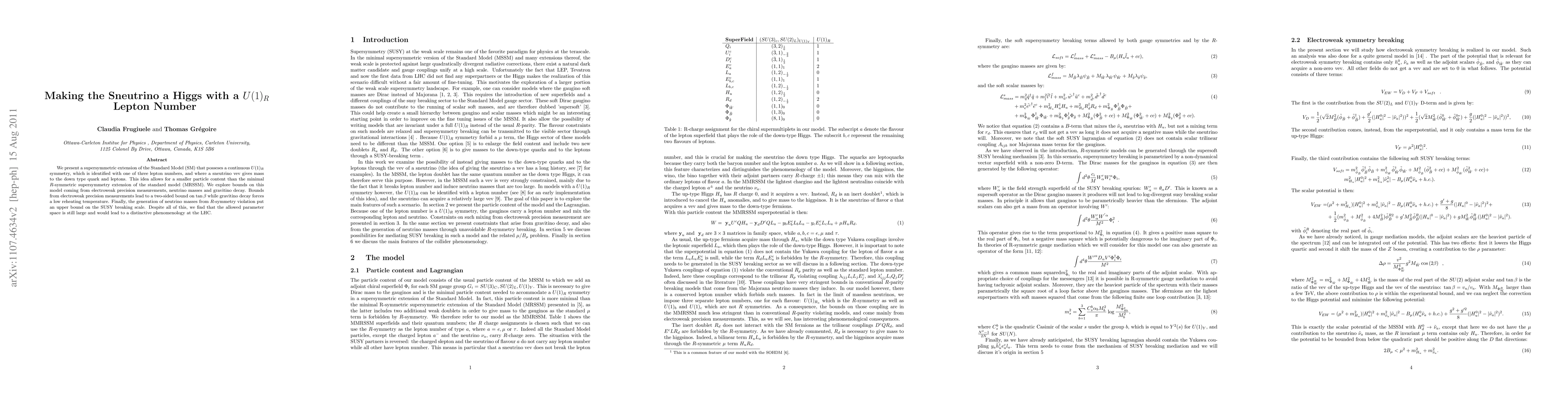 We present a supersymmetric extension of the Standard Model that posseses a continuous $ U(1)_R$ symmetry, which is identified with one of three lepton numbers, and where a sneutrino vev gives mass to the down type quark and leptons. This idea allows for a smaller particle content than the minimal $R$-symmetric supersymmetry extension of the standard model (MRSSM). We explore bounds on this model coming from electroweak precision measurements, neutrino masses and gravitino decay. Bounds from electroweak precision measurements lead to a two-sided bound on $\tan \beta$ while gravitino decay forces a low reheating temperature. Finally, the generation of neutrino masses from $R$-symmetry violation put an upper bound on the SUSY breaking scale. Despite all of this, we find that the allowed parameter space is still large and would lead to a distinctive phenomenology at the LHC.