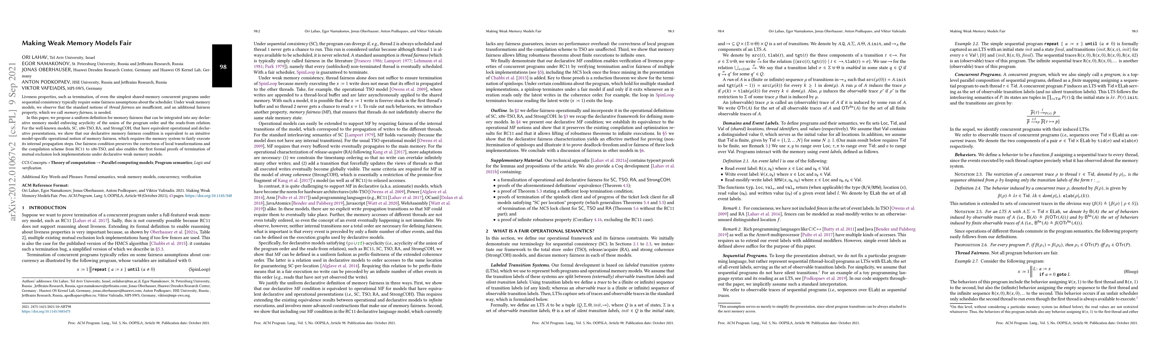 This paper proposes a uniform definition for memory fairness to address liveness properties in weak memory models, showing its equivalence to existing operational notions for several well-known models. It enables formal proofs of termination for mutual exclusion under declarative weak memory models.