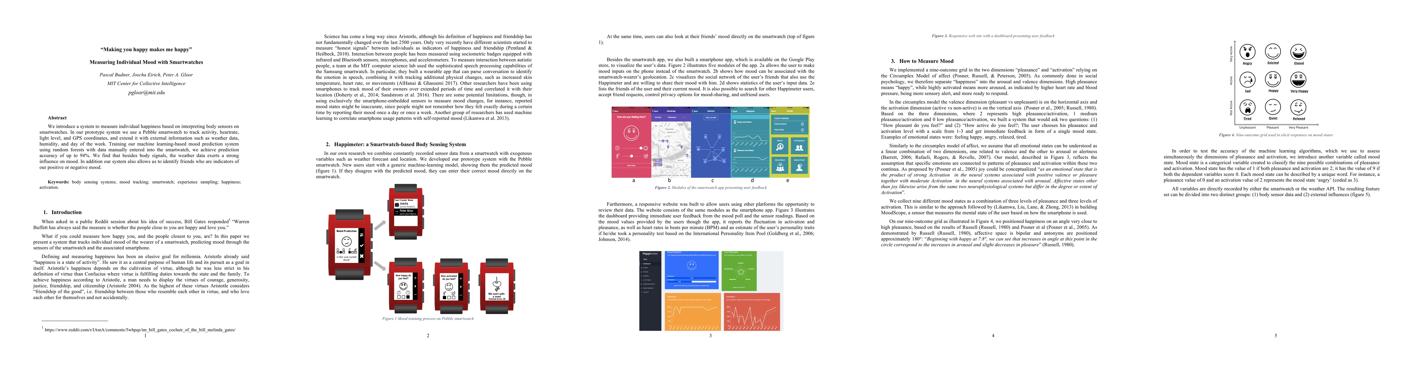 We introduce a system to measure individual happiness based on interpreting body sensors on smartwatches. In our prototype system we use a Pebble smartwatch to track activity, heartrate, light level, and GPS coordinates, and extend it with external information such as weather data, humidity, and day of the week. Training our machine learning-based mood prediction system using random forests with data manually entered into the smartwatch, we achieve prediction accuracy of up to 94%. We find that besides body signals, the weather data exerts a strong influence on mood. In addition our system also allows us to identify friends who are indicators of our positive or negative mood.