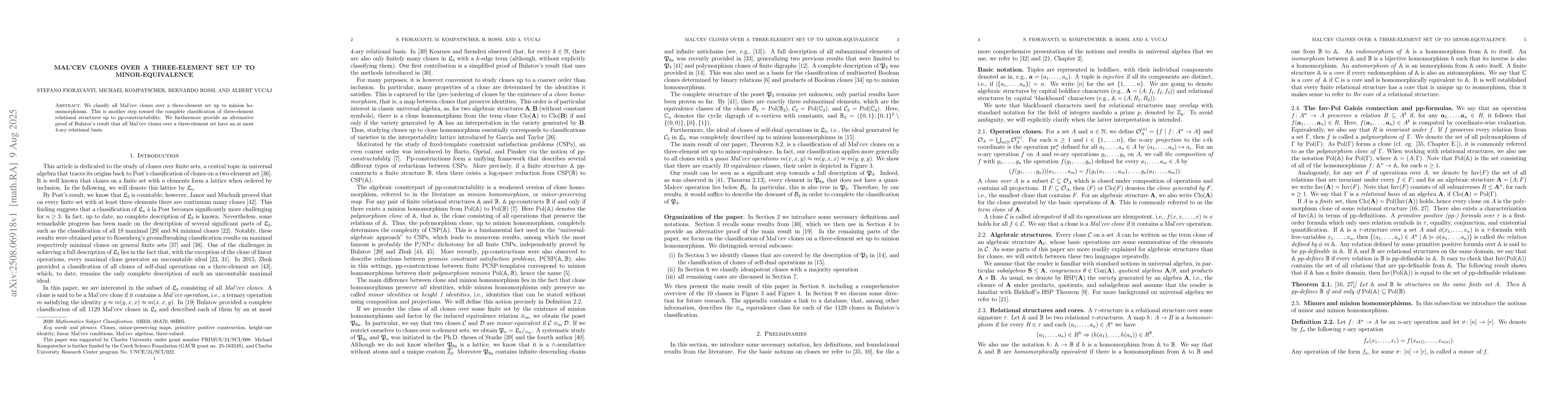 The research employs a classification approach for Mal'cev clones over a three-element set, utilizing minion homomorphisms and pp-definability to establish a complete classification.