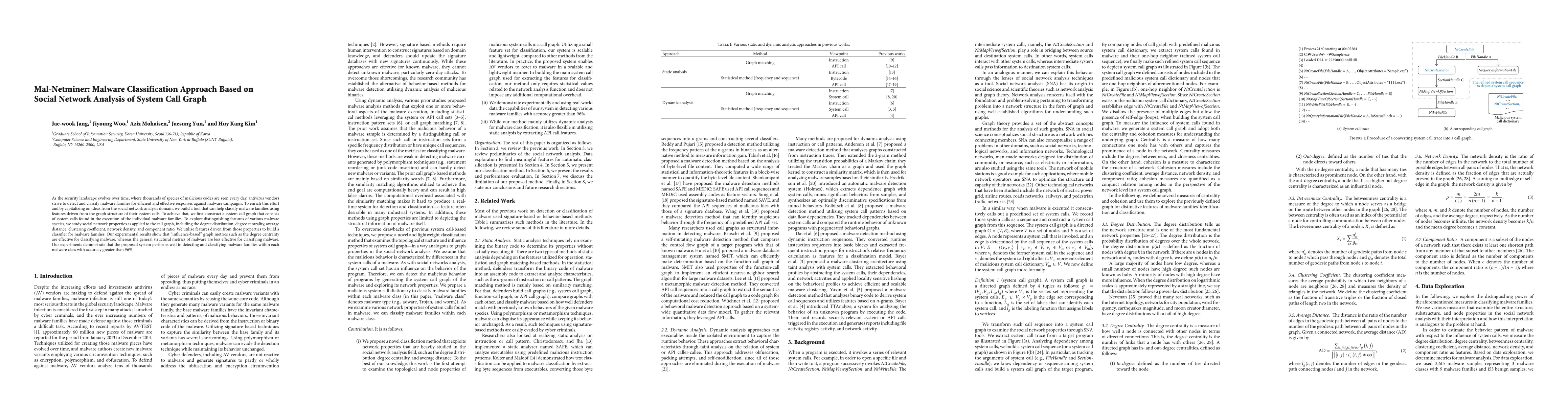 The paper introduces Mal-Netminer, a tool for classifying malware families using social network analysis of system call graphs. Experimental results show that influence-based graph metrics like degree centrality are highly effective for malware classification, achieving over 96% accuracy.