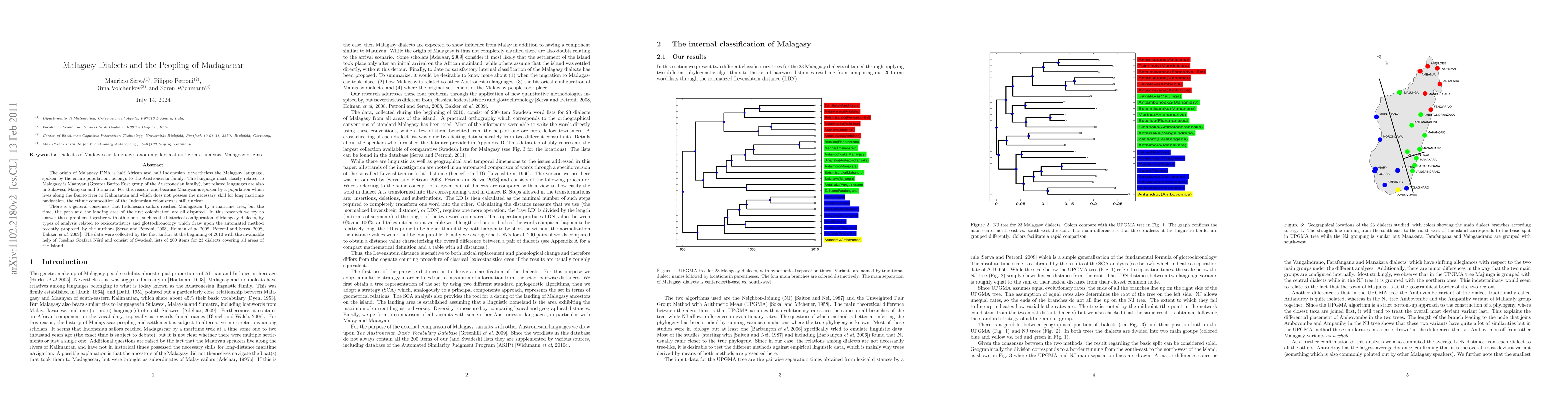 The origin of Malagasy DNA is half African and half Indonesian, nevertheless the Malagasy language, spoken by the entire population, belongs to the Austronesian family. The language most closely related to Malagasy is Maanyan (Greater Barito East group of the Austronesian family), but related languages are also in Sulawesi, Malaysia and Sumatra. For this reason, and because Maanyan is spoken by a population which lives along the Barito river in Kalimantan and which does not possess the necessary skill for long maritime navigation, the ethnic composition of the Indonesian colonizers is still unclear. There is a general consensus that Indonesian sailors reached Madagascar by a maritime trek, but the time, the path and the landing area of the first colonization are all disputed. In this research we try to answer these problems together with other ones, such as the historical configuration of Malagasy dialects, by types of analysis related to lexicostatistics and glottochronology which draw upon the automated method recently proposed by the authors \cite{Serva:2008, Holman:2008, Petroni:2008, Bakker:2009}. The data were collected by the first author at the beginning of 2010 with the invaluable help of Joselin\`a Soafara N\'er\'e and consist of Swadesh lists of 200 items for 23 dialects covering all areas of the Island.