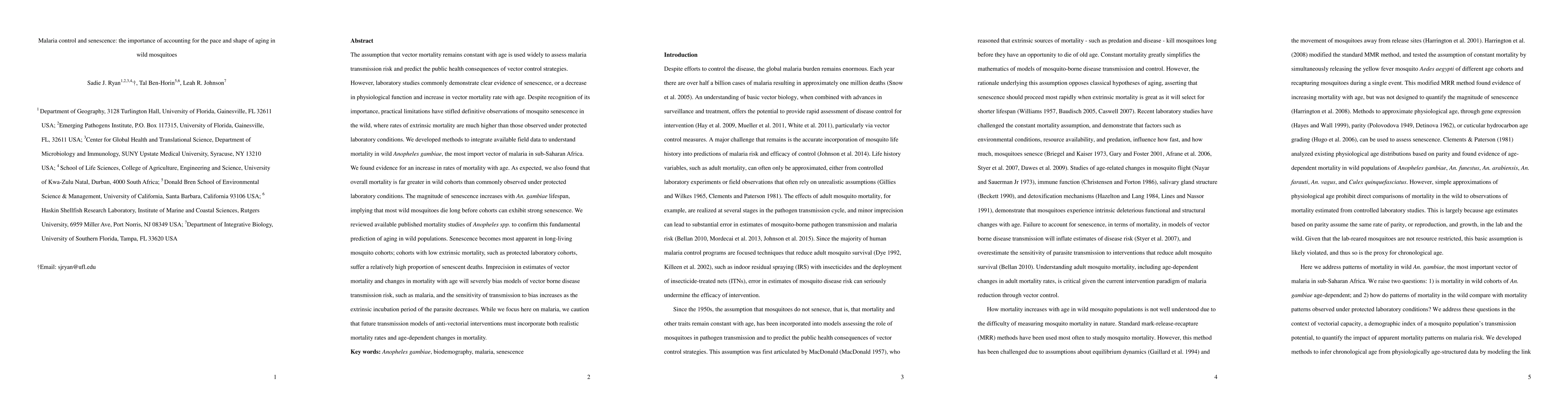 The assumption that vector mortality remains constant with age is used widely to assess malaria transmission risk and predict the public health consequences of vector control strategies. However, laboratory studies commonly demonstrate clear evidence of senescence, or a decrease in physiological function and increase in vector mortality rate with age. We developed methods to integrate available field data to understand mortality in wild Anopheles gambiae, the most import vector of malaria in sub-Saharan Africa. We found evidence for an increase in rates of mortality with age, a component of senescence. As expected, we also found that overall mortality is far greater in wild cohorts than commonly observed under protected laboratory conditions. The magnitude of senescence increases with An. gambiae lifespan, implying that wild mosquitoes die long before cohorts can exhibit strong senescence. We reviewed available published mortality studies of Anopheles spp. to confirm this fundamental prediction of aging in wild populations. Senescence becomes most apparent in long-living mosquito cohorts, and cohorts with low extrinsic mortality, such as those raised under protected laboratory conditions, suffer a relatively high proportion of senescent deaths. Imprecision in estimates of vector mortality and changes in mortality with age will severely bias models of vector borne disease transmission risk, such as malaria, and the sensitivity of transmission to bias increases as the extrinsic incubation period of the parasite decreases. While we focus here on malaria, we caution that future models for anti-vectorial interventions must therefore incorporate both realistic mortality rates and age-dependent changes in vector mortality.