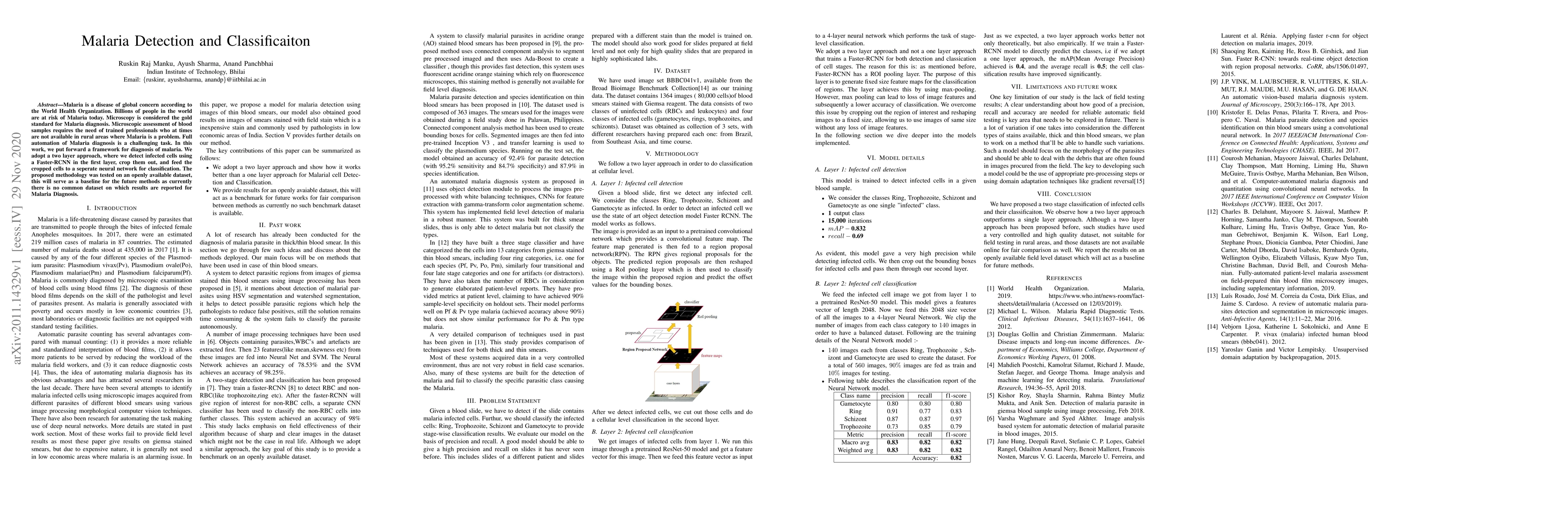 Malaria is a disease of global concern according to the World Health Organization. Billions of people in the world are at risk of Malaria today. Microscopy is considered the gold standard for Malaria diagnosis. Microscopic assessment of blood samples requires the need of trained professionals who at times are not available in rural areas where Malaria is a problem. Full automation of Malaria diagnosis is a challenging task. In this work, we put forward a framework for diagnosis of malaria. We adopt a two layer approach, where we detect infected cells using a Faster-RCNN in the first layer, crop them out, and feed the cropped cells to a seperate neural network for classification. The proposed methodology was tested on an openly available dataset, this will serve as a baseline for the future methods as currently there is no common dataset on which results are reported for Malaria Diagnosis.