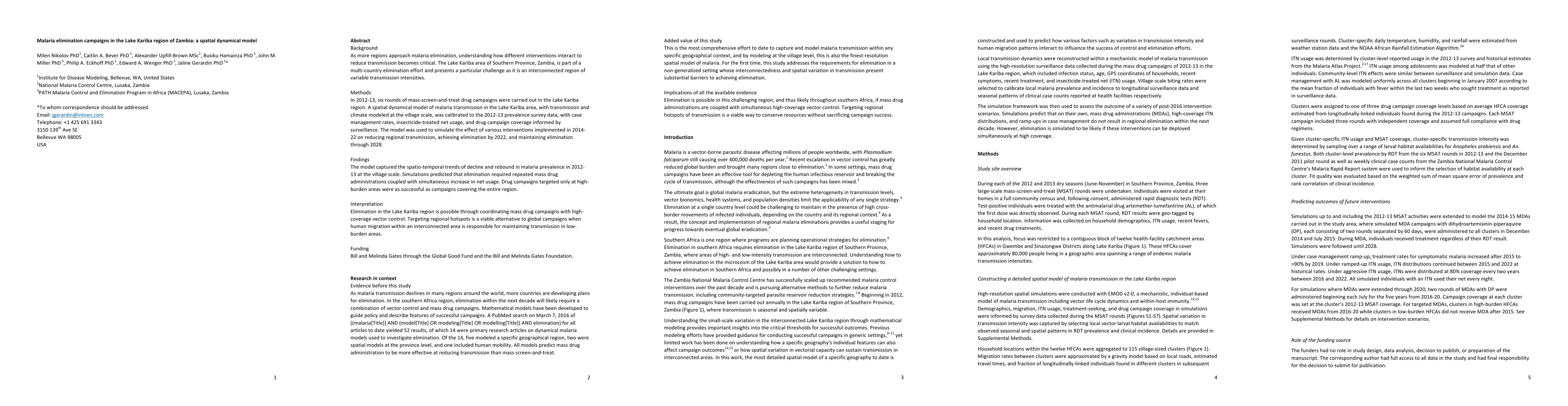 The study models malaria transmission in Zambia's Lake Kariba region, showing that elimination is feasible with coordinated mass drug campaigns and increased vector control. Targeted interventions in high-burden areas are as effective as region-wide campaigns due to human migration sustaining low-burden areas.