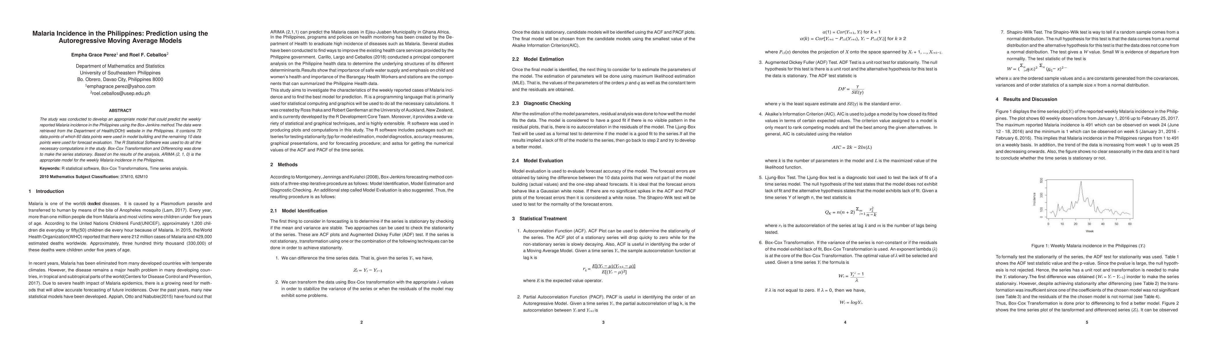 This study develops an ARIMA (2, 1, 0) model using the Box-Jenkins method to predict weekly malaria incidence in the Philippines, utilizing 60 data points for model building and 10 for validation. The R Statistical Software facilitated computations, with Box-Cox transformation and differencing applied to achieve stationarity.