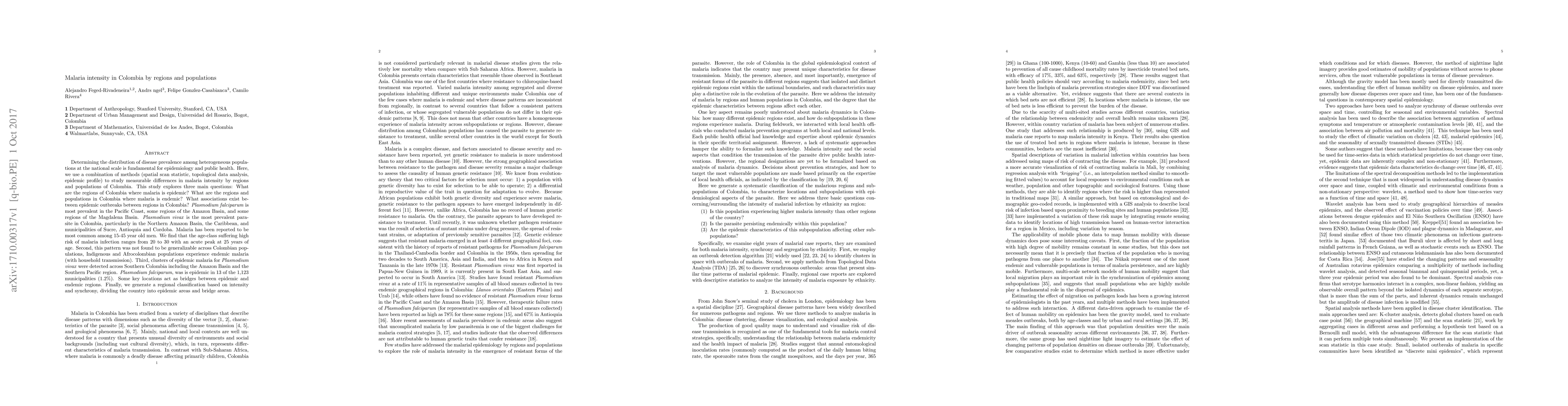 Determining the distribution of disease prevalence among heterogeneous populations at the national scale is fundamental for epidemiology and public health. Here, we use a combination of methods (spatial scan statistic, topological data analysis, epidemic profile) to study measurable differences in malaria intensity by regions and populations of Colombia. This study explores three main questions: What are the regions of Colombia where malaria is epidemic? What are the regions and populations in Colombia where malaria is endemic? What associations exist between epidemic outbreaks between regions in Colombia? \textit{Plasmodium falciparum} is most prevalent in the Pacific Coast, some regions of the Amazon Basin, and some regions of the Magdalena Basin. \textit{Plasmodium vivax} is the most prevalent parasite in Colombia, particularly in the Northern Amazon Basin, the Caribbean, and municipalities of Sucre, Antioquia and Cordoba. Malaria has been reported to be most common among 15-45 year old men. We find that the age-class suffering high risk of malaria infection ranges from 20 to 30 with an acute peak at 25 years of age. Second, this pattern was not found to be generalizable across Colombian populations, Indigenous and Afrocolombian populations experience endemic malaria (with household transmission). Third, clusters of epidemic malaria for \textit{Plasmodium vivax} were detected across Southern Colombia including the Amazon Basin and the Southern Pacific region. \textit{Plasmodium falciparum}, was is epidemic in 13 of the 1,123 municipalities (1.2\%). Some key locations act as bridges between epidemic and endemic regions. Finally, we generate a regional classification based on intensity and synchrony, dividing the country into epidemic areas and bridge areas.
