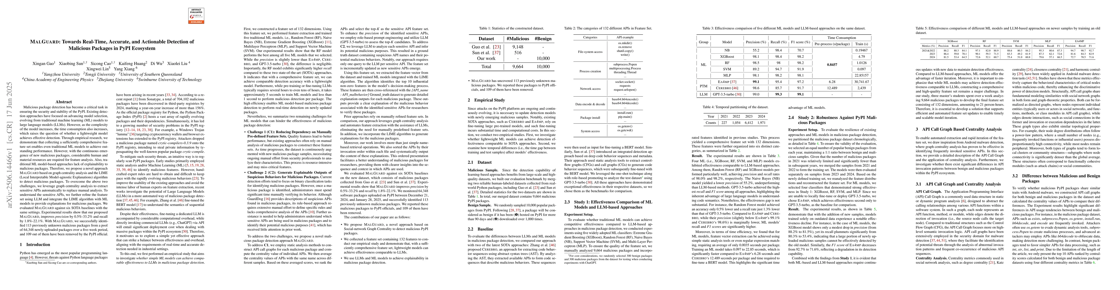 Malicious package detection has become a critical task in ensuring the security and stability of the PyPI. Existing detection approaches have focused on advancing model selection, evolving from traditional machine learning (ML) models to large language models (LLMs). However, as the complexity of the model increases, the time consumption also increases, which raises the question of whether a lightweight model achieves effective detection. Through empirical research, we demonstrate that collecting a sufficiently comprehensive feature set enables even traditional ML models to achieve outstanding performance. However, with the continuous emergence of new malicious packages, considerable human and material resources are required for feature analysis. Also, traditional ML model-based approaches lack of explainability to malicious packages.Therefore, we propose a novel approach MalGuard based on graph centrality analysis and the LIME (Local Interpretable Model-agnostic Explanations) algorithm to detect malicious packages.To overcome the above two challenges, we leverage graph centrality analysis to extract sensitive APIs automatically to replace manual analysis. To understand the sensitive APIs, we further refine the feature set using LLM and integrate the LIME algorithm with ML models to provide explanations for malicious packages. We evaluated MalGuard against six SOTA baselines with the same settings. Experimental results show that our proposed MalGuard, improves precision by 0.5%-33.2% and recall by 1.8%-22.1%. With MalGuard, we successfully identified 113 previously unknown malicious packages from a pool of 64,348 newly-uploaded packages over a five-week period, and 109 out of them have been removed by the PyPI official.
