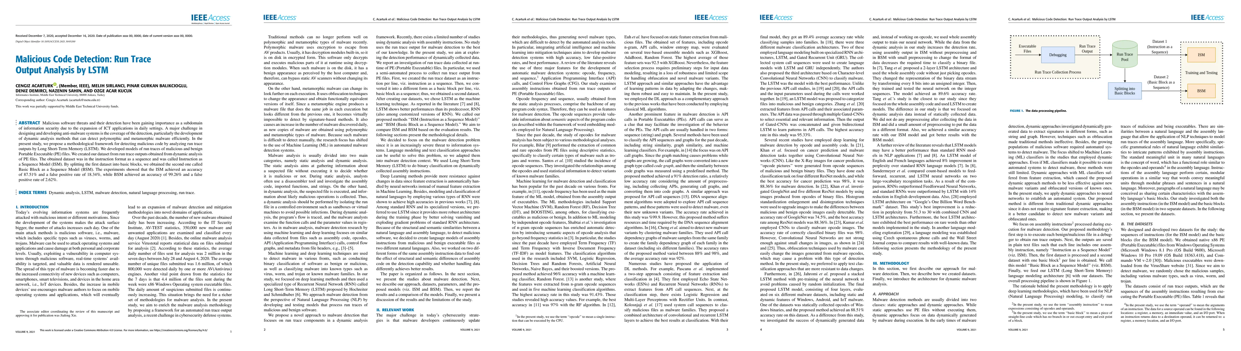 Malicious software threats and their detection have been gaining importance as a subdomain of information security due to the expansion of ICT applications in daily settings. A major challenge in designing and developing anti-malware systems is the coverage of the detection, particularly the development of dynamic analysis methods that can detect polymorphic and metamorphic malware efficiently. In the present study, we propose a methodological framework for detecting malicious code by analyzing run trace outputs by Long Short-Term Memory (LSTM). We developed models of run traces of malicious and benign Portable Executable (PE) files. We created our dataset from run trace outputs obtained from dynamic analysis of PE files. The obtained dataset was in the instruction format as a sequence and was called Instruction as a Sequence Model (ISM). By splitting the first dataset into basic blocks, we obtained the second one called Basic Block as a Sequence Model (BSM). The experiments showed that the ISM achieved an accuracy of 87.51% and a false positive rate of 18.34%, while BSM achieved an accuracy of 99.26% and a false positive rate of 2.62%.