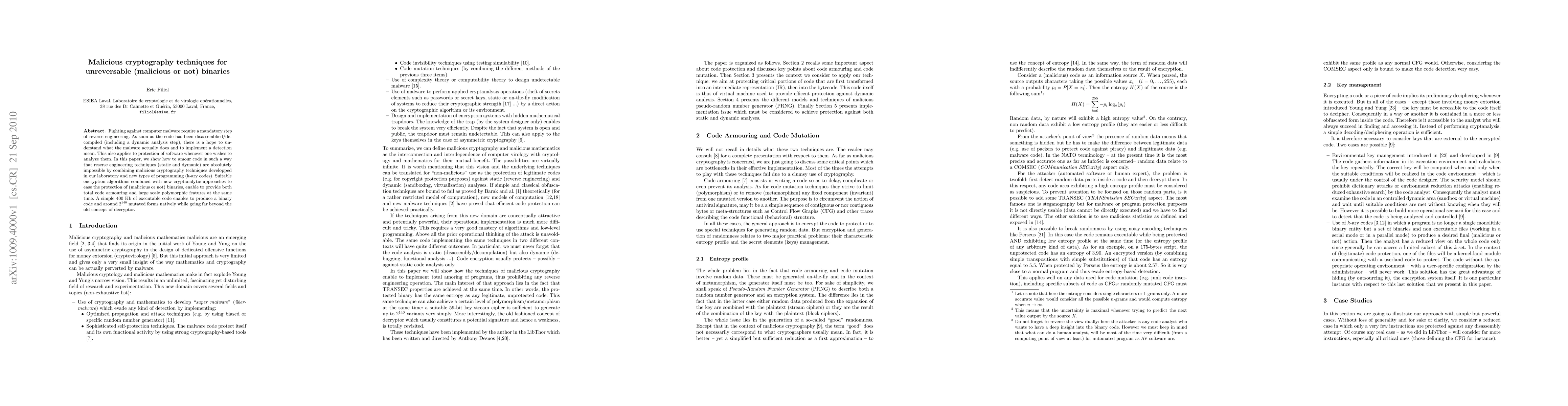 Fighting against computer malware require a mandatory step of reverse engineering. As soon as the code has been disassemblied/decompiled (including a dynamic analysis step), there is a hope to understand what the malware actually does and to implement a detection mean. This also applies to protection of software whenever one wishes to analyze them. In this paper, we show how to amour code in such a way that reserse engineering techniques (static and dymanic) are absolutely impossible by combining malicious cryptography techniques developped in our laboratory and new types of programming (k-ary codes). Suitable encryption algorithms combined with new cryptanalytic approaches to ease the protection of (malicious or not) binaries, enable to provide both total code armouring and large scale polymorphic features at the same time. A simple 400 Kb of executable code enables to produce a binary code and around $2^{140}$ mutated forms natively while going far beyond the old concept of decryptor.