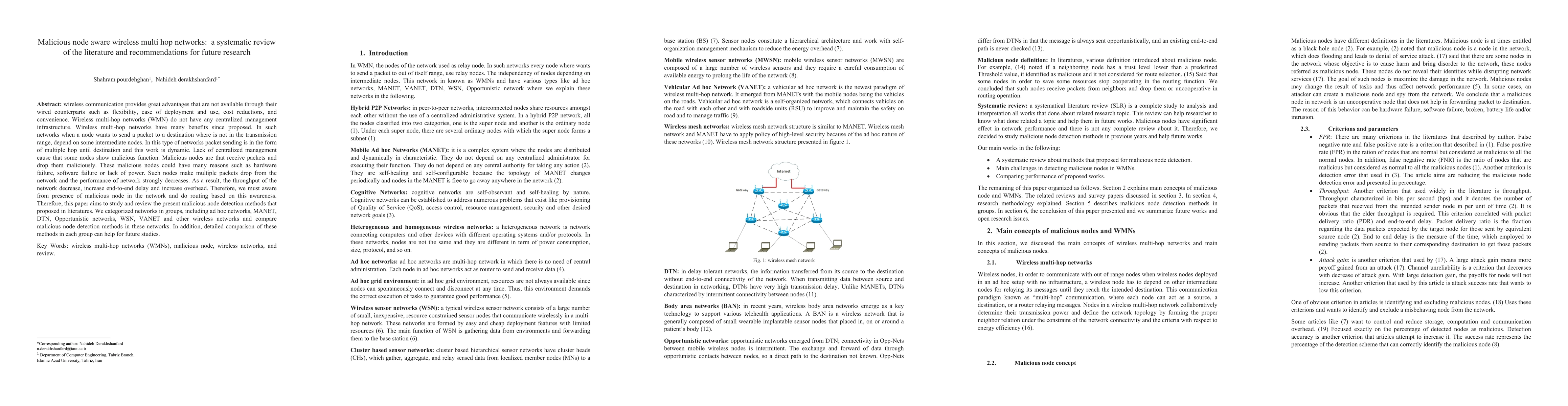 Wireless communication provides great advantages that are not available through their wired counterparts such as flexibility, ease of deployment and use, cost reductions, and convenience. Wireless multi-hop networks (WMN) do not have any centralized management infrastructure. Wireless multi-hop networks have many benefits since proposed. In such networks when a node wants to send a packet to a destination where is not in the transmission range, depend on some intermediate nodes. In this type of networks packet sending is in the form of multiple hop until destination and this work is dynamic. Lack of centralized management cause that some nodes show malicious function. Malicious nodes are that receive packets and drop them maliciously. These malicious nodes could have many reasons such as hardware failure, software failure or lack of power. Such nodes make multiple packets drop from the network and the performance of network strongly decreases. As a result, the throughput of the network decrease, increase end-to-end delay and increase overhead. Therefore, we must aware from presence of malicious node in the network and do routing based on this awareness. Therefore, this paper aims to study and review the present malicious node detection methods that proposed in literatures. We categorized networks in groups, including ad hoc networks, MANET, DTN, Opportunistic networks, WSN, VANET and other wireless networks and compare malicious node detection met