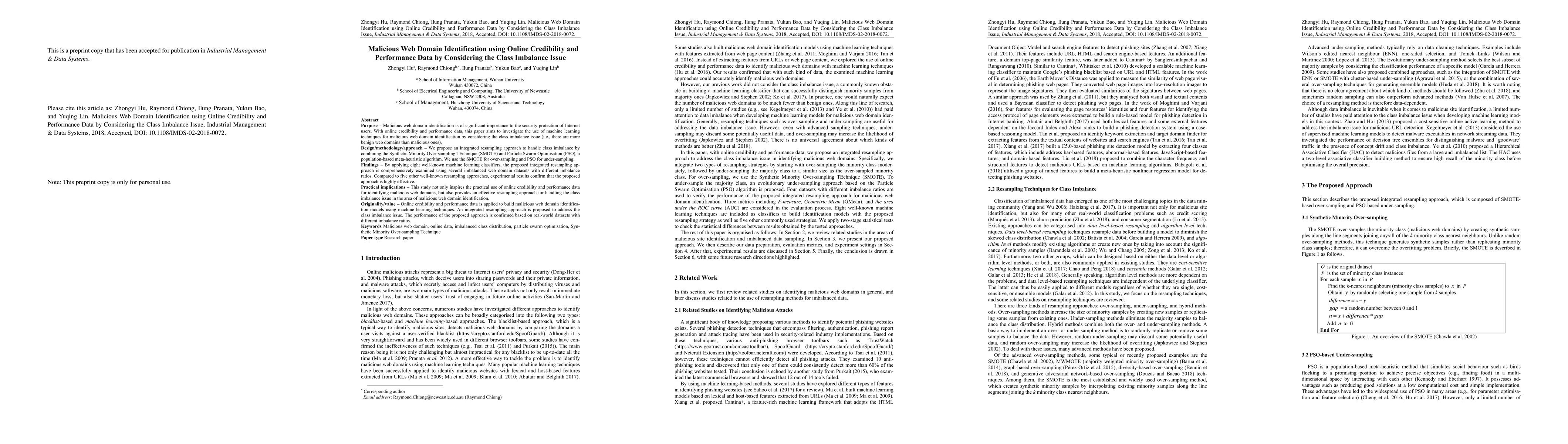 Purpose: Malicious web domain identification is of significant importance to the security protection of Internet users. With online credibility and performance data, this paper aims to investigate the use of machine learning tech-niques for malicious web domain identification by considering the class imbalance issue (i.e., there are more benign web domains than malicious ones). Design/methodology/approach: We propose an integrated resampling approach to handle class imbalance by combining the Synthetic Minority Over-sampling TEchnique (SMOTE) and Particle Swarm Optimisation (PSO), a population-based meta-heuristic algorithm. We use the SMOTE for over-sampling and PSO for under-sampling. Findings: By applying eight well-known machine learning classifiers, the proposed integrated resampling approach is comprehensively examined using several imbalanced web domain datasets with different imbalance ratios. Com-pared to five other well-known resampling approaches, experimental results confirm that the proposed approach is highly effective. Practical implications: This study not only inspires the practical use of online credibility and performance data for identifying malicious web domains, but also provides an effective resampling approach for handling the class imbal-ance issue in the area of malicious web domain identification. Originality/value: Online credibility and performance data is applied to build malicious web domain identification models using machine learning techniques. An integrated resampling approach is proposed to address the class im-balance issue. The performance of the proposed approach is confirmed based on real-world datasets with different imbalance ratios.