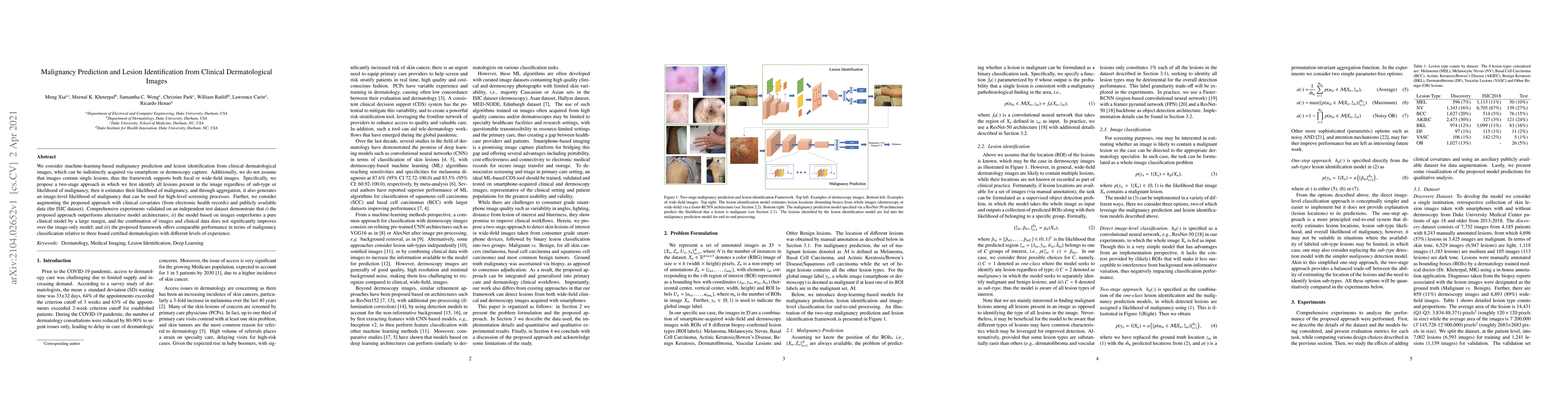 We consider machine-learning-based malignancy prediction and lesion identification from clinical dermatological images, which can be indistinctly acquired via smartphone or dermoscopy capture. Additionally, we do not assume that images contain single lesions, thus the framework supports both focal or wide-field images. Specifically, we propose a two-stage approach in which we first identify all lesions present in the image regardless of sub-type or likelihood of malignancy, then it estimates their likelihood of malignancy, and through aggregation, it also generates an image-level likelihood of malignancy that can be used for high-level screening processes. Further, we consider augmenting the proposed approach with clinical covariates (from electronic health records) and publicly available data (the ISIC dataset). Comprehensive experiments validated on an independent test dataset demonstrate that i) the proposed approach outperforms alternative model architectures; ii) the model based on images outperforms a pure clinical model by a large margin, and the combination of images and clinical data does not significantly improves over the image-only model; and iii) the proposed framework offers comparable performance in terms of malignancy classification relative to three board certified dermatologists with different levels of experience.