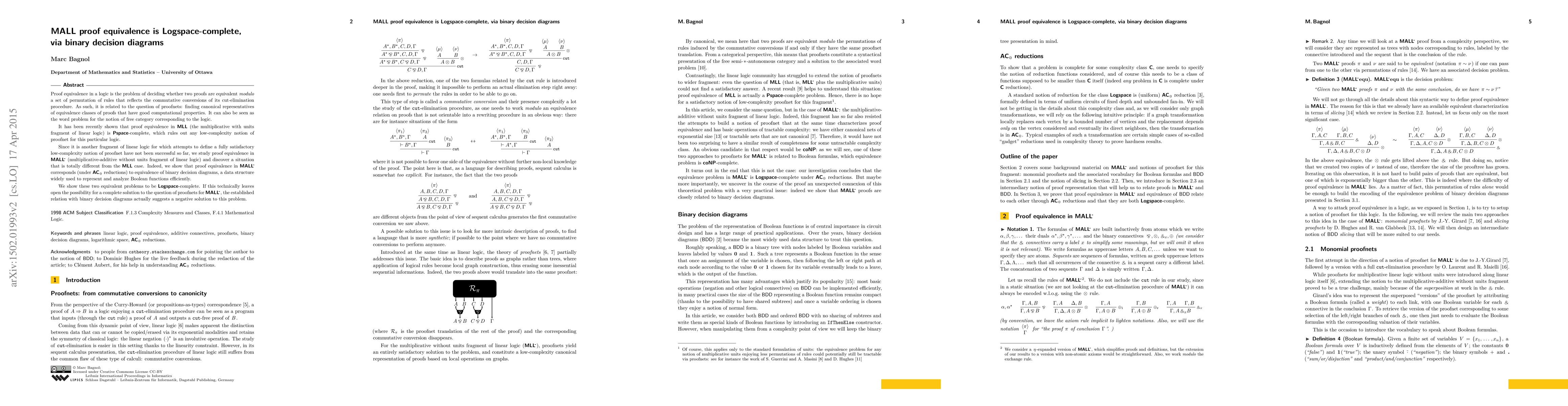 Proof equivalence in a logic is the problem of deciding whether two proofs are equivalent modulo a set of permutation of rules that reflects the commutative conversions of its cut-elimination procedure. As such, it is related to the question of proofnets: finding canonical representatives of equivalence classes of proofs that have good computational properties. It can also be seen as the word problem for the notion of free category corresponding to the logic. It has been recently shown that proof equivalence in MLL (the multiplicative with units fragment of linear logic) is PSPACE-complete, which rules out any low-complexity notion of proofnet for this particular logic. Since it is another fragment of linear logic for which attempts to define a fully satisfactory low-complexity notion of proofnet have not been successful so far, we study proof equivalence in MALL- (multiplicative-additive without units fragment of linear logic) and discover a situation that is totally different from the MLL case. Indeed, we show that proof equivalence in MALL- corresponds (under AC0 reductions) to equivalence of binary decision diagrams, a data structure widely used to represent and analyze Boolean functions efficiently. We show these two equivalent problems to be LOGSPACE-complete. If this technically leaves open the possibility for a complete solution to the question of proofnets for MALL-, the established relation with binary decision diagrams actually suggests a negative solution to this problem.