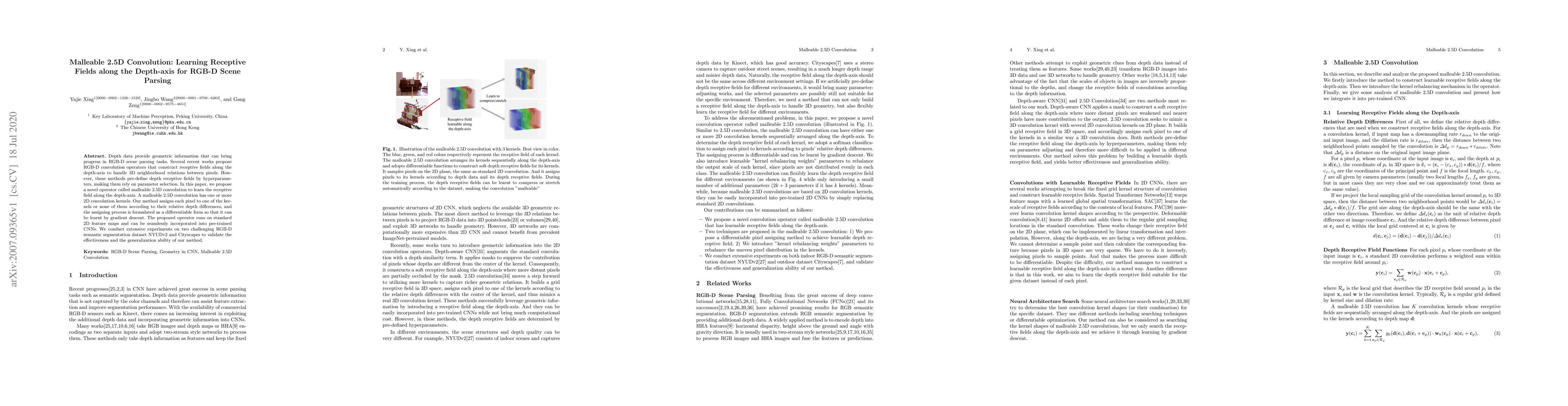 A new convolution operator, malleable 2.5D convolution, is proposed to learn receptive fields along the depth-axis for RGB-D scene parsing, offering a more flexible approach than existing methods.