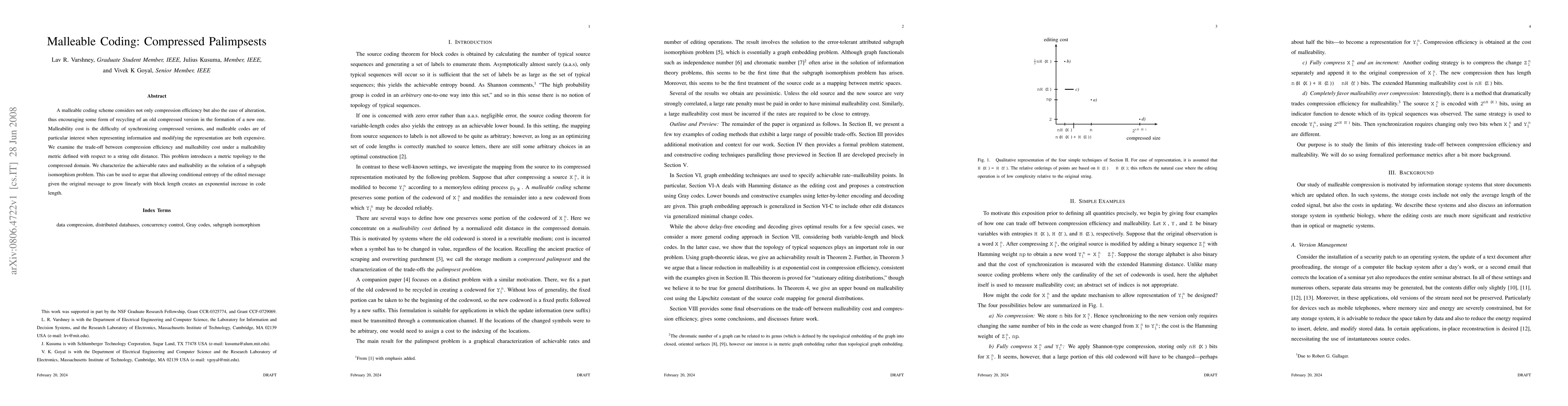 A malleable coding scheme considers not only compression efficiency but also the ease of alteration, thus encouraging some form of recycling of an old compressed version in the formation of a new one. Malleability cost is the difficulty of synchronizing compressed versions, and malleable codes are of particular interest when representing information and modifying the representation are both expensive. We examine the trade-off between compression efficiency and malleability cost under a malleability metric defined with respect to a string edit distance. This problem introduces a metric topology to the compressed domain. We characterize the achievable rates and malleability as the solution of a subgraph isomorphism problem. This can be used to argue that allowing conditional entropy of the edited message given the original message to grow linearly with block length creates an exponential increase in code length.