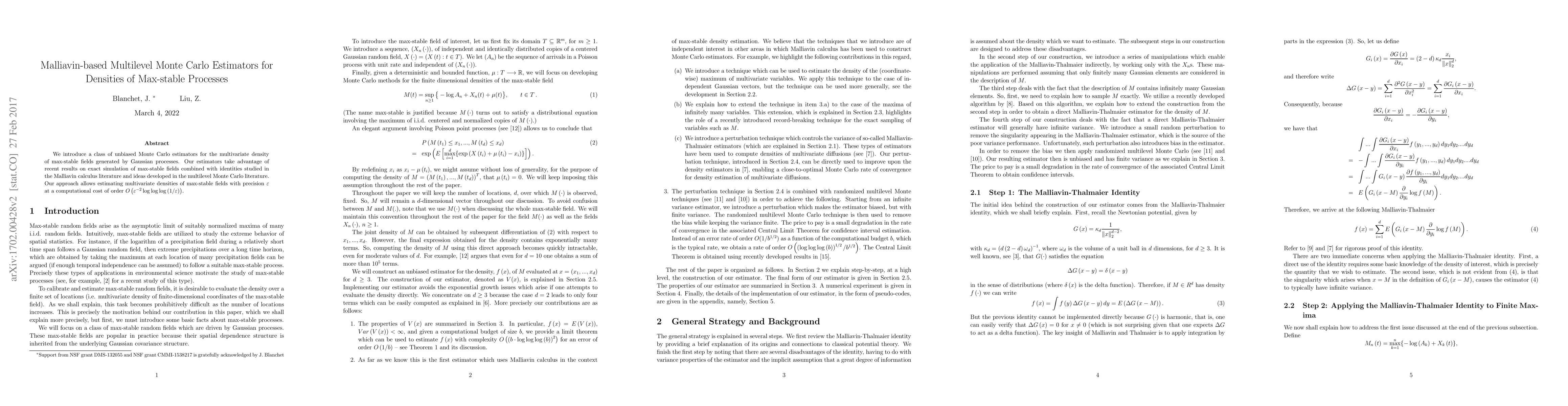 This paper proposes unbiased Monte Carlo estimators for the multivariate density of max-stable fields generated by Gaussian processes, leveraging exact simulation techniques and Malliavin calculus. The multilevel Monte Carlo approach achieves precision $\varepsilon$ with computational cost $O\left( \varepsilon^{-2}\log \log \log \left( 1/\varepsilon \right) \right)$.