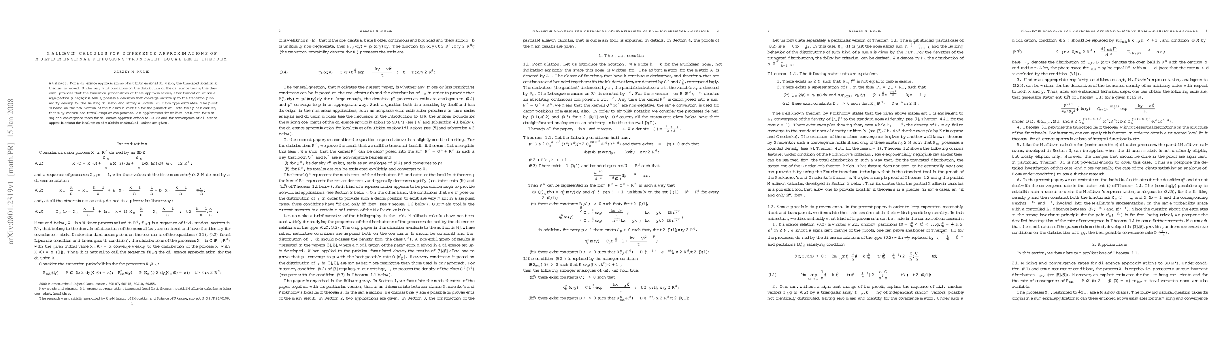 For a difference approximations of multidimensional diffusion, the truncated local limit theorem is proved. Under very mild conditions on the distribution of the difference terms, this theorem provides that the transition probabilities of these approximations, after truncation of some asymptotically negligible terms, possess a densities that converge uniformly to the transition probability density for the limiting diffusion and satisfy a uniform diffusion-type estimates. The proof is based on the new version of the Malliavin calculus for the product of finite family of measures, that may contain non-trivial singular components. An applications for uniform estimates for mixing and convergence rates for difference approximations to SDE's and for convergence of difference approximations for local times of multidimensional diffusions are given.