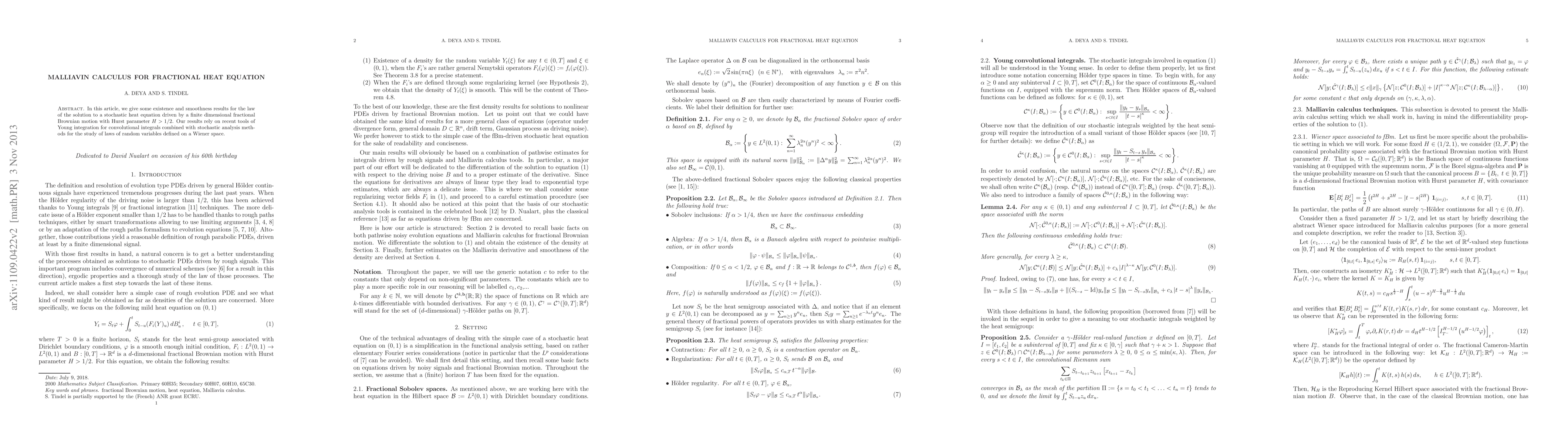 In this article, we give some existence and smoothness results for the law of the solution to a stochastic heat equation driven by a finite dimensional fractional Brownian motion with Hurst parameter $H>1/2$. Our results rely on recent tools of Young integration for convolutional integrals combined with stochastic analysis methods for the study of laws of random variables defined on a Wiener space.