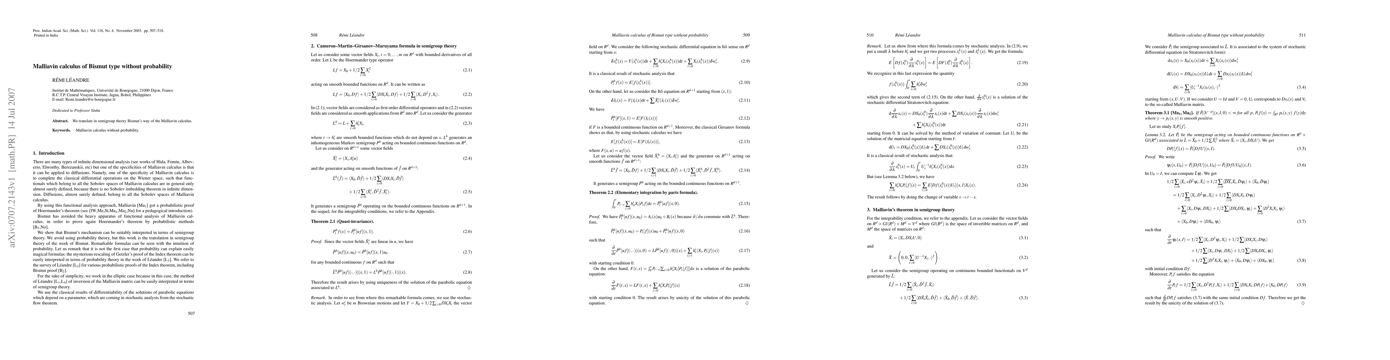Summary: This paper adapts Bismut's Malliavin calculus approach into semigroup theory, providing a probabilistic-free interpretation of the method. The translation aims to extend the utility of Malliavin calculus beyond traditional probabilistic frameworks.
