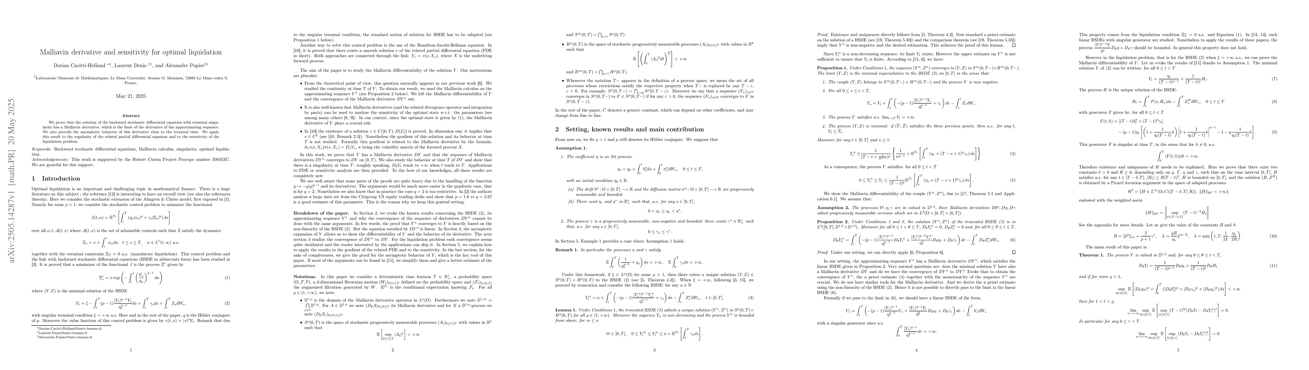 This work extends existing results on Malliavin calculus to a specific class of BSDEs with terminal singularities, providing new insights into liquidation problem sensitivity.