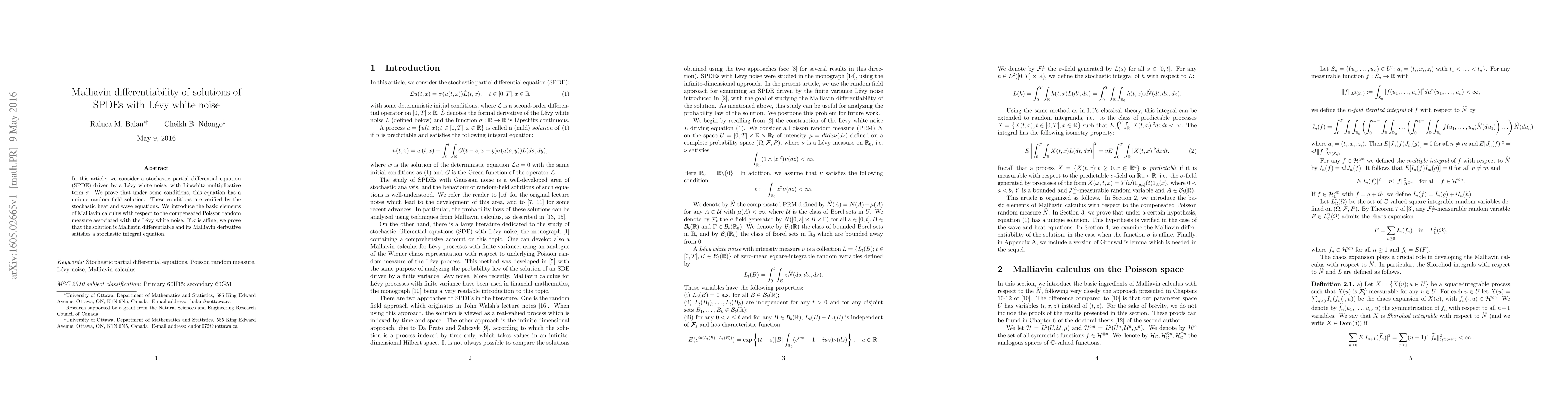 This paper explores SPDEs driven by Lévy white noise with a Lipschitz multiplicative term $\sigma$, proving the existence of a unique random field solution under certain conditions. It introduces Malliavin calculus for the Lévy noise and demonstrates that when $\sigma$ is affine, the solution is Malliavin differentiable, with its derivative satisfying a stochastic integral equation.