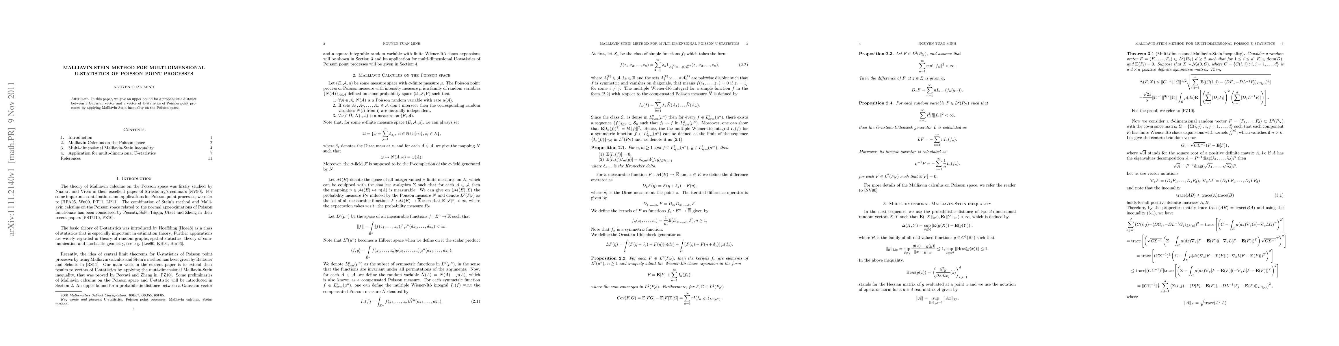 Summary: This paper provides an upper bound for the probabilistic distance between a Gaussian vector and U-statistics from Poisson point processes using the Malliavin-Stein inequality on Poisson space. The method is applied to analyze the asymptotic behavior of these statistical measures.
