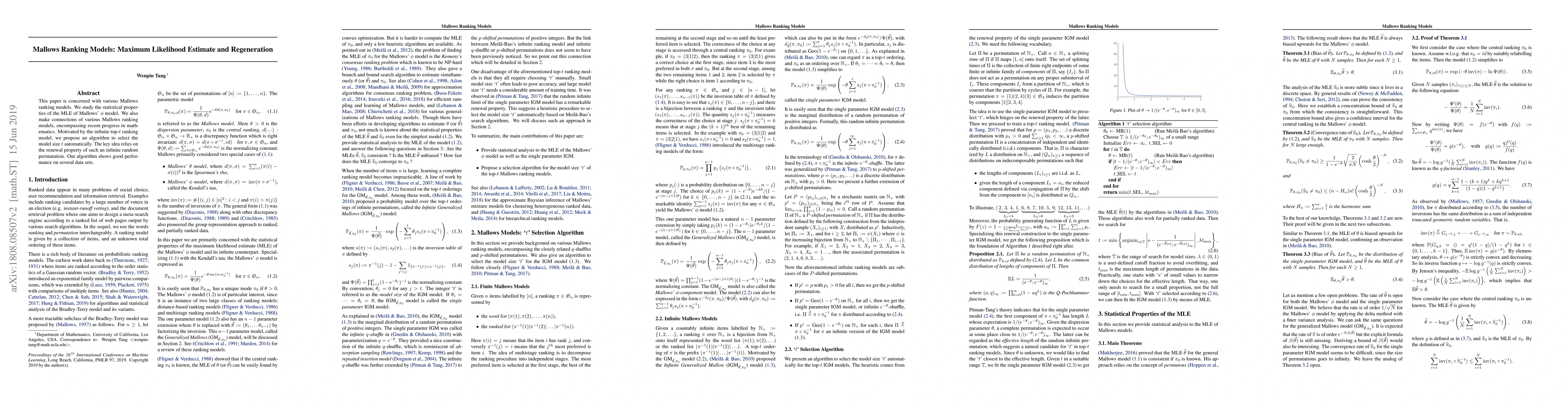 This paper is concerned with various Mallows ranking models. We study the statistical properties of the MLE of Mallows' $\phi$ model. We also make connections of various Mallows ranking models, encompassing recent progress in mathematics. Motivated by the infinite top-$t$ ranking model, we propose an algorithm to select the model size $t$ automatically. The key idea relies on the renewal property of such an infinite random permutation. Our algorithm shows good performance on several data sets.