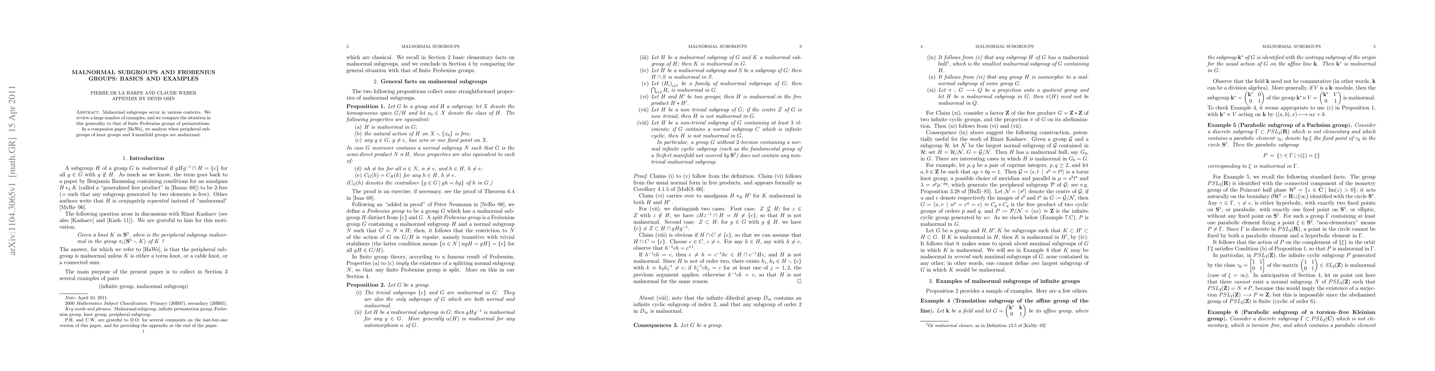 Summary: This paper reviews examples of malnormal subgroups across various contexts and compares their behavior to that of finite Frobenius groups, with a follow-up study focusing on malnormal peripheral subgroups in knot and 3-manifold groups.