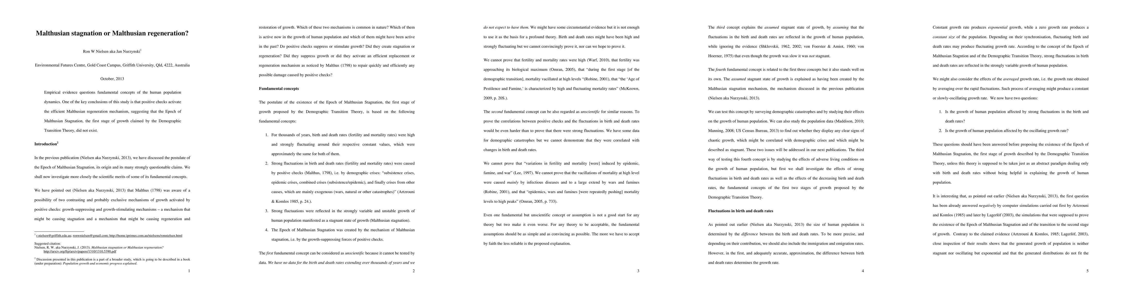 This study challenges the notion of Malthusian stagnation, demonstrating that positive checks trigger a regenerative mechanism, thereby refuting the existence of the first growth stage in the Demographic Transition Theory.