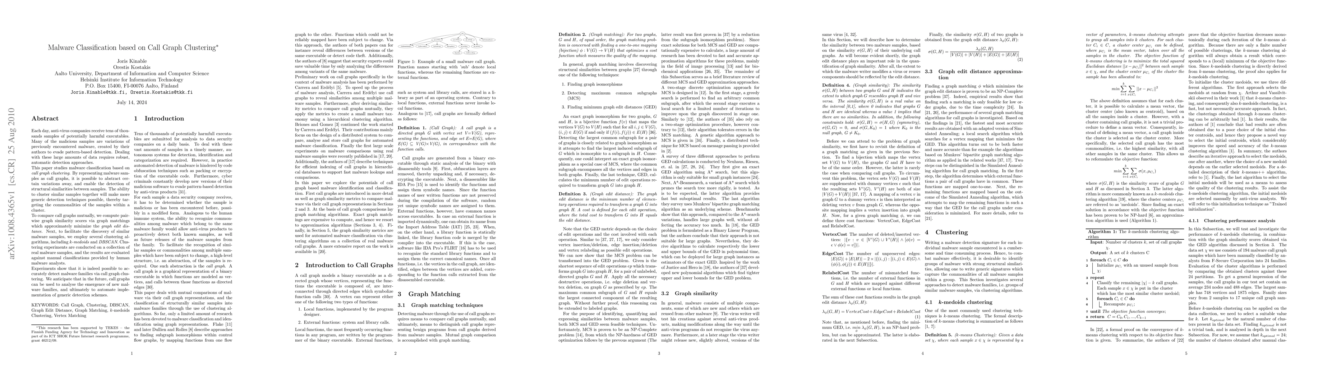 This paper proposes a method for malware classification using call graph clustering to detect structural similarities among malware samples, enabling the identification of malware families. Experiments show accurate detection of malware families, suggesting potential for automating generic detection schemes.