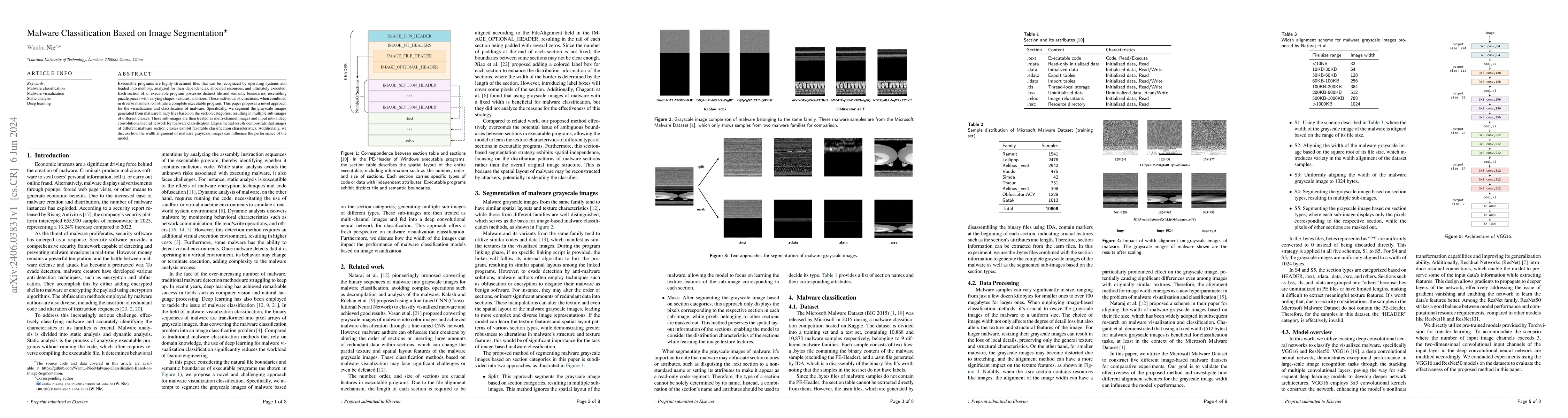 This paper introduces a novel method for malware classification using image segmentation. It segments grayscale images derived from malware binaries into section-based sub-images, which are processed by a convolutional neural network, yielding strong classification results and highlighting the impact of grayscale image width alignment on model performance.