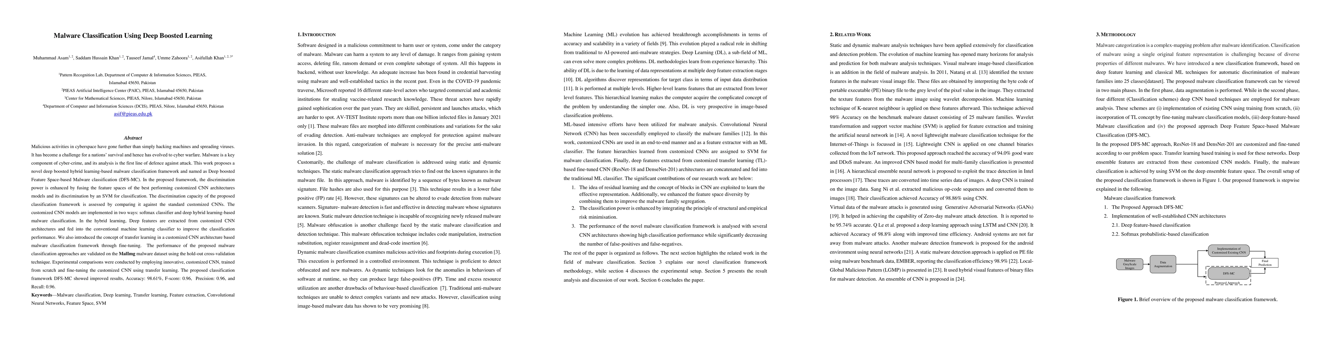 This paper proposes a novel Deep Boosted Feature Space-based Malware Classification (DFS-MC) framework that combines customized CNN architectures with SVM for enhanced malware detection. The framework shows superior performance with an accuracy of 98.61%, F-score, precision, and recall all at 0.96, outperforming standard CNN models.