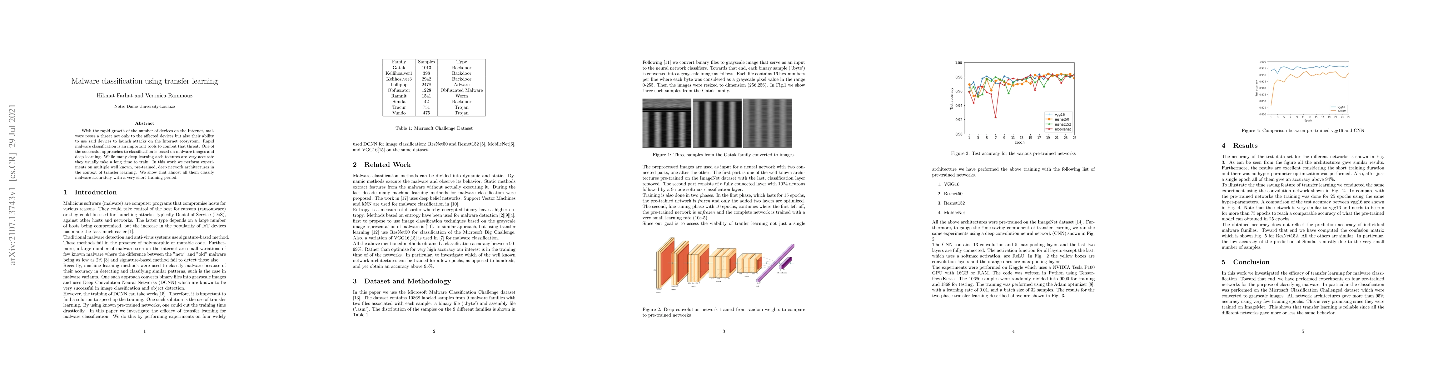 With the rapid growth of the number of devices on the Internet, malware poses a threat not only to the affected devices but also their ability to use said devices to launch attacks on the Internet ecosystem. Rapid malware classification is an important tools to combat that threat. One of the successful approaches to classification is based on malware images and deep learning. While many deep learning architectures are very accurate they usually take a long time to train. In this work we perform experiments on multiple well known, pre-trained, deep network architectures in the context of transfer learning. We show that almost all them classify malware accurately with a very short training period.
