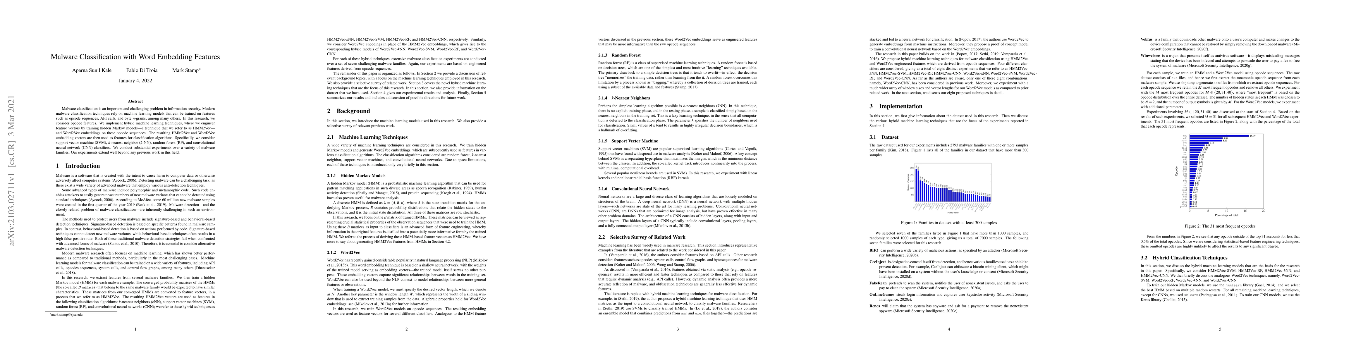 Malware classification is an important and challenging problem in information security. Modern malware classification techniques rely on machine learning models that can be trained on features such as opcode sequences, API calls, and byte $n$-grams, among many others. In this research, we consider opcode features. We implement hybrid machine learning techniques, where we engineer feature vectors by training hidden Markov models -- a technique that we refer to as HMM2Vec -- and Word2Vec embeddings on these opcode sequences. The resulting HMM2Vec and Word2Vec embedding vectors are then used as features for classification algorithms. Specifically, we consider support vector machine (SVM), $k$-nearest neighbor ($k$-NN), random forest (RF), and convolutional neural network (CNN) classifiers. We conduct substantial experiments over a variety of malware families. Our experiments extend well beyond any previous work in this field.